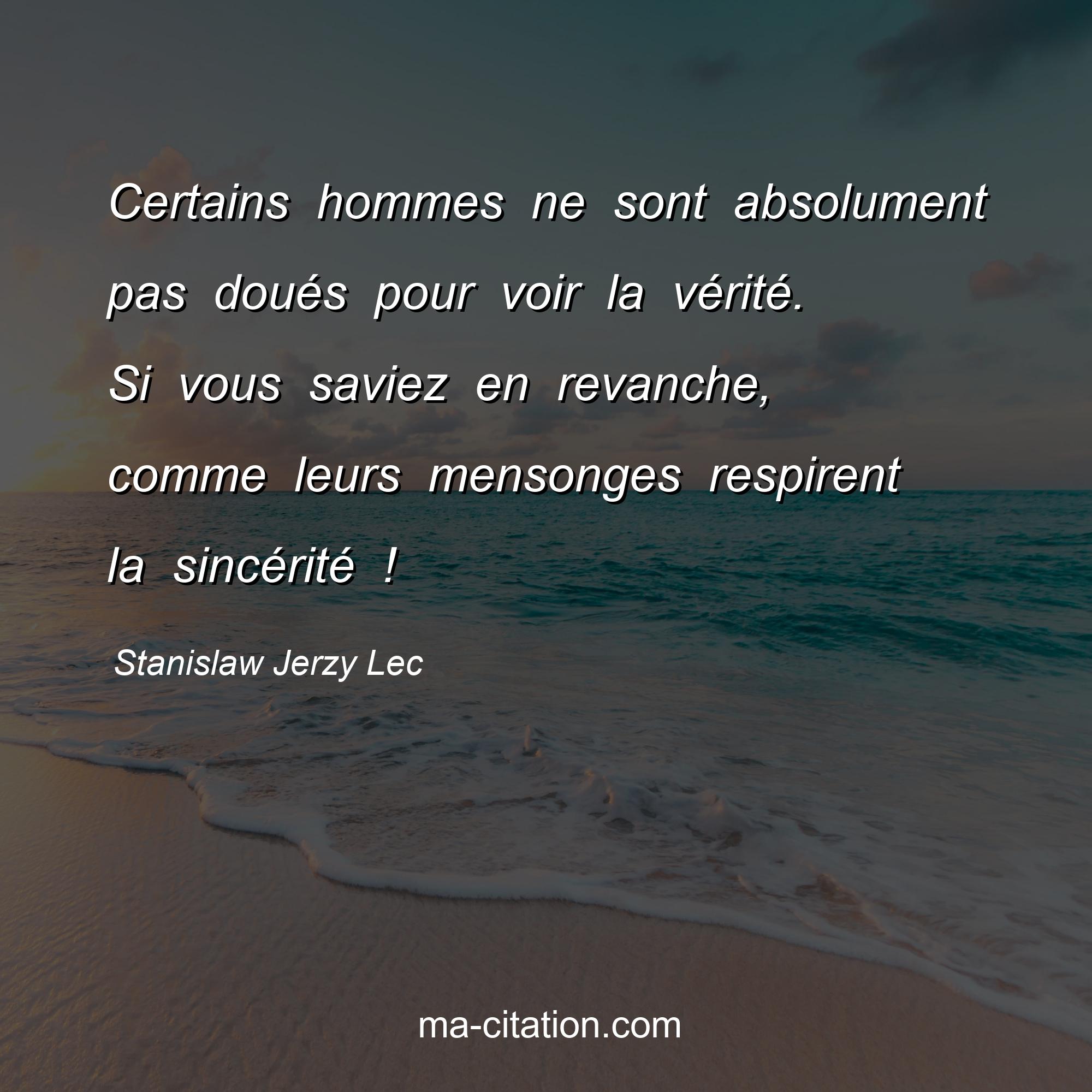 Citation sur la vie de Stanislaw Jerzy Lec :Certains hommes ne sont absolument pas doués pour voir la vérité. Si vous saviez en revanche, comme leurs mensonges respirent la sincérité !