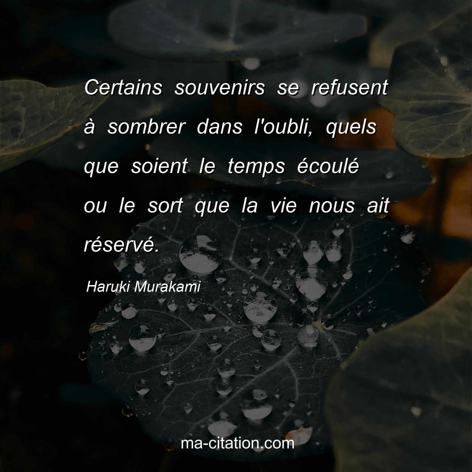 Citation sur la vie de Haruki Murakami :Certains souvenirs se refusent à sombrer dans l'oubli, quels que soient le temps écoulé ou le sort que la vie nous ait réservé.