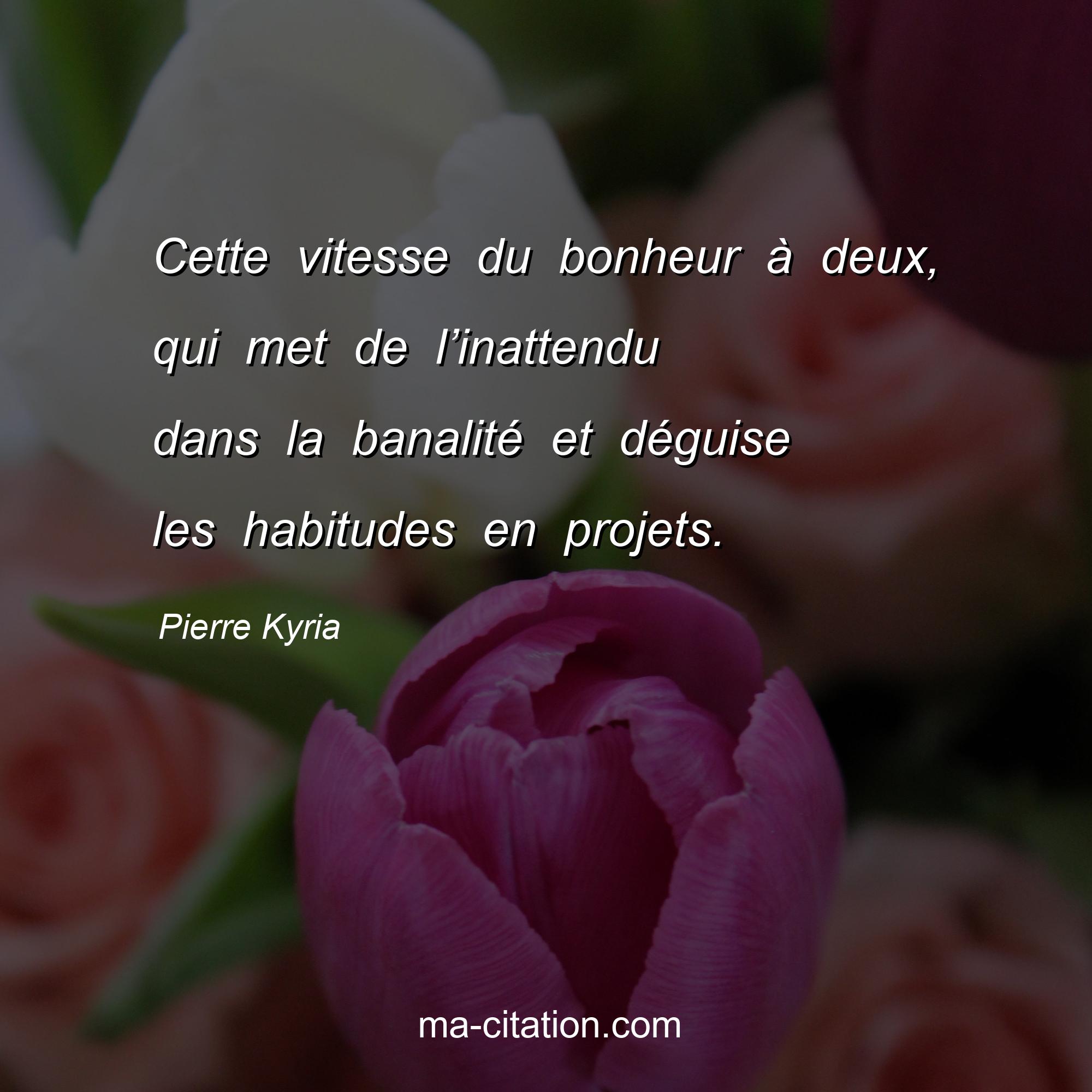 Pierre Kyria est l'auteur de la citation sur la vie "Cette vitesse du bonheur à deux, qui met de l’inattendu dans la banalité et déguise les habitudes en projets.".