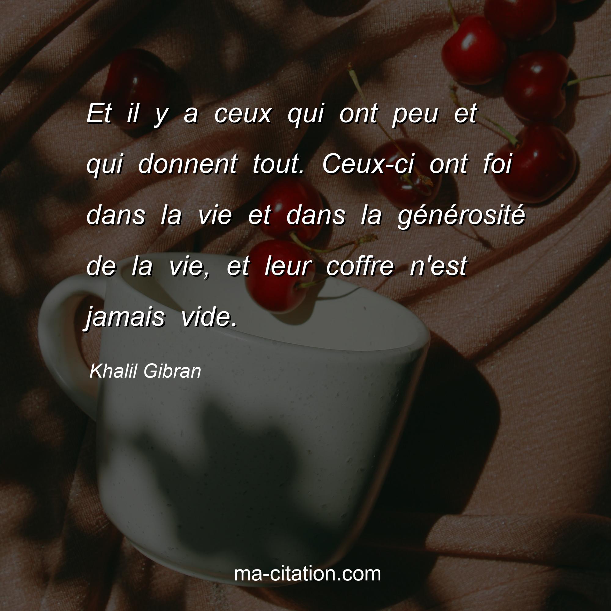 Citation sur la vie de Khalil Gibran :Et il y a ceux qui ont peu et qui donnent tout. Ceux-ci ont foi dans la vie et dans la générosité de la vie, et leur coffre n'est jamais vide.