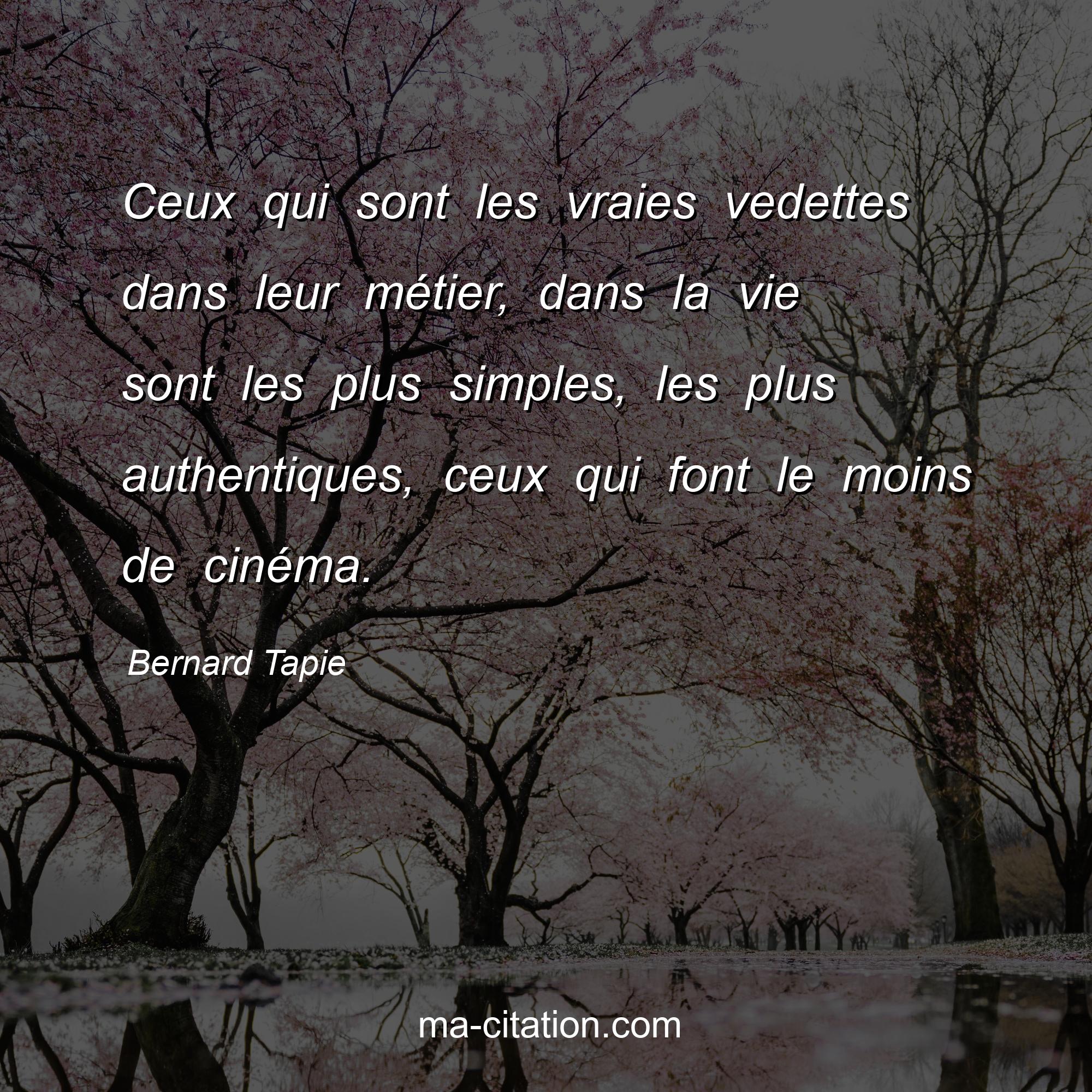 Citation sur la vie de Bernard Tapie :Ceux qui sont les vraies vedettes dans leur métier, dans la vie sont les plus simples, les plus authentiques, ceux qui font le moins de cinéma.