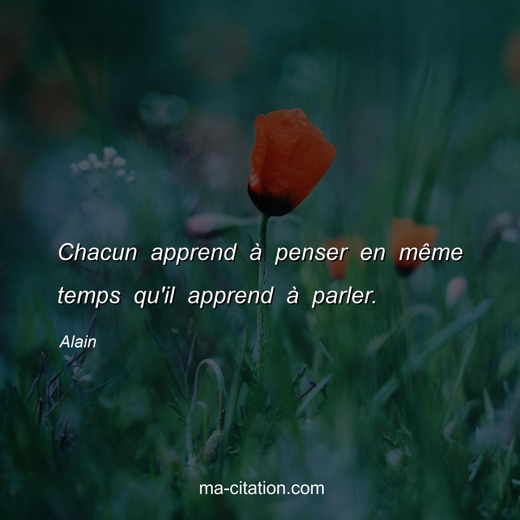 Citation sur la vie d'Alain :Chacun apprend à penser en même temps qu'il apprend à parler.