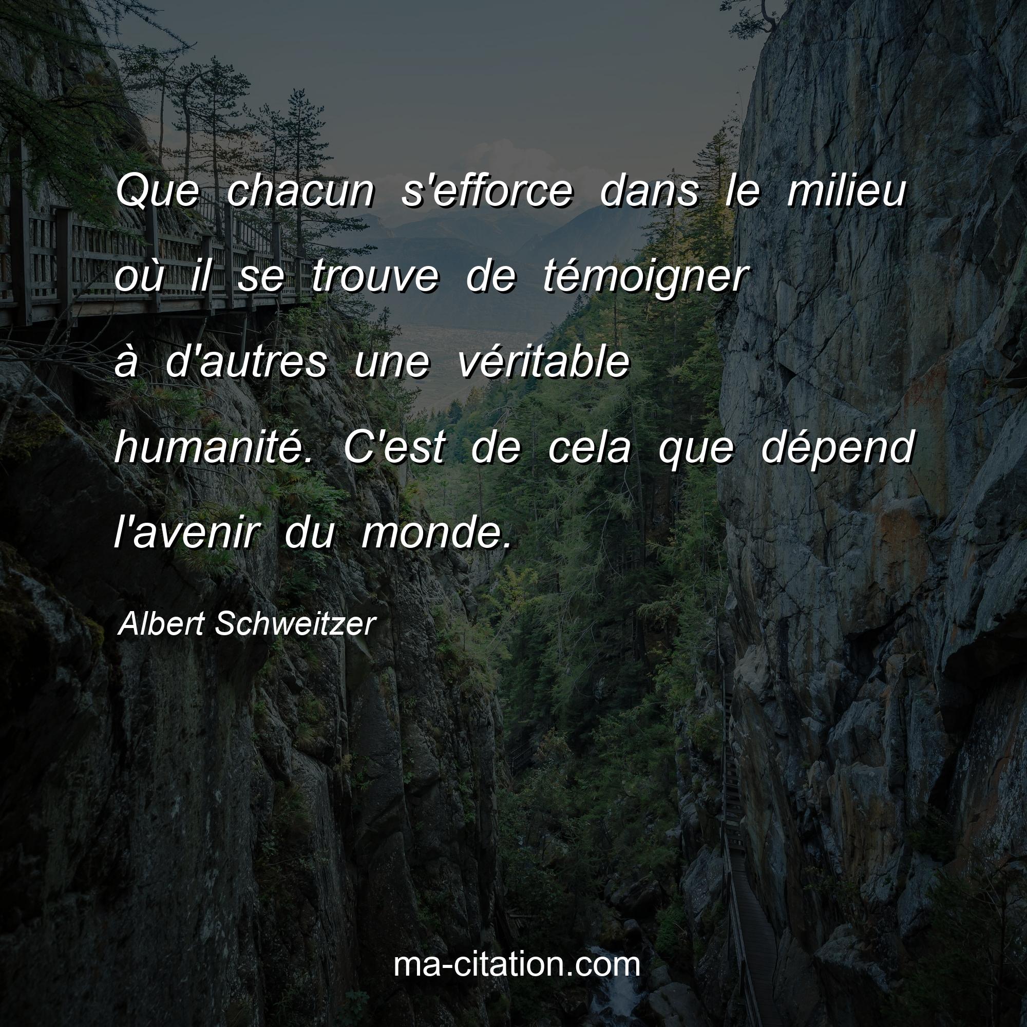 Citation sur la vie d'Albert Schweitzer :Que chacun s'efforce dans le milieu où il se trouve de témoigner à d'autres une véritable humanité. C'est de cela que dépend l'avenir du monde.