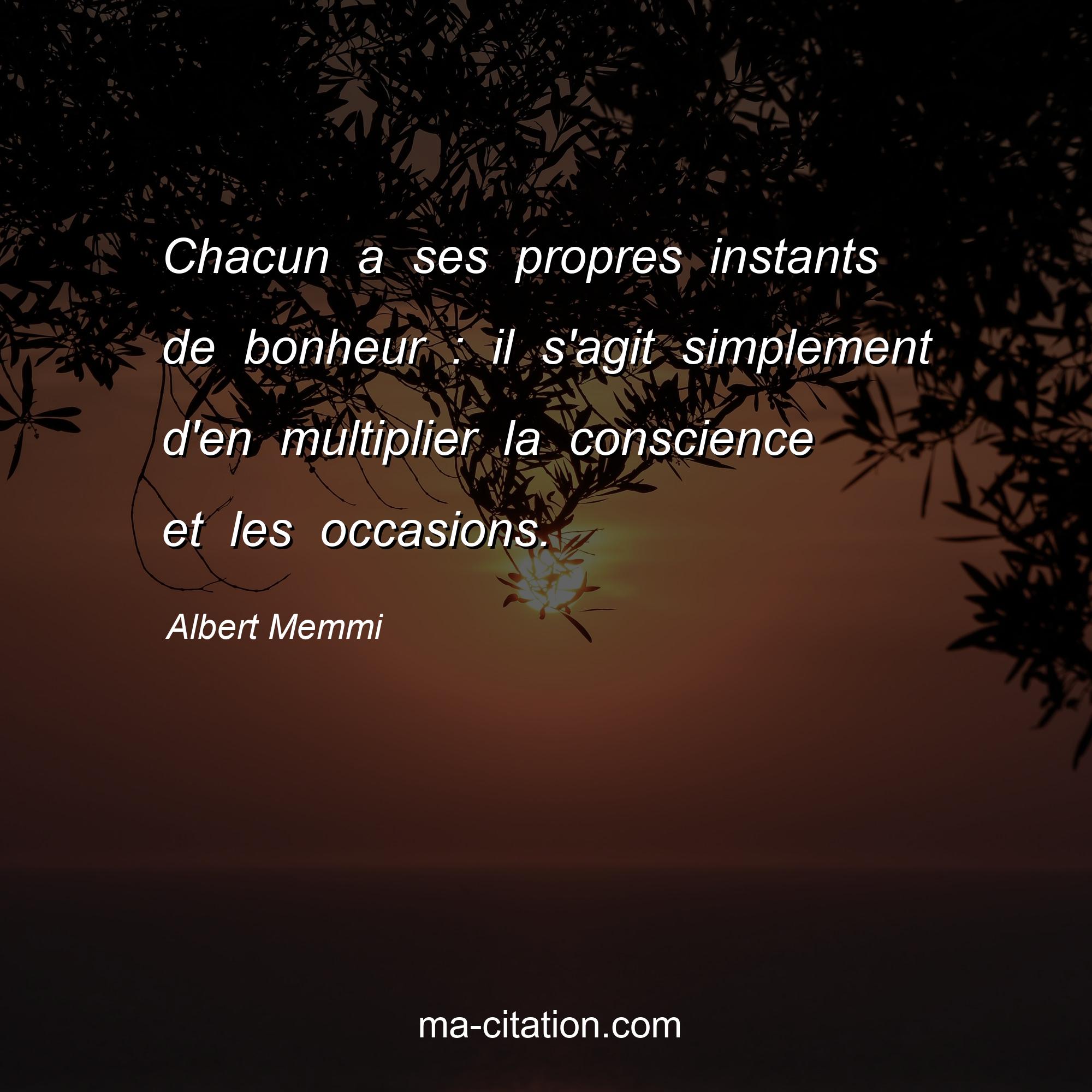 Albert Memmi est l'auteur de la citation sur la vie "Chacun a ses propres instants de bonheur : il s'agit simplement d'en multiplier la conscience et les occasions.".