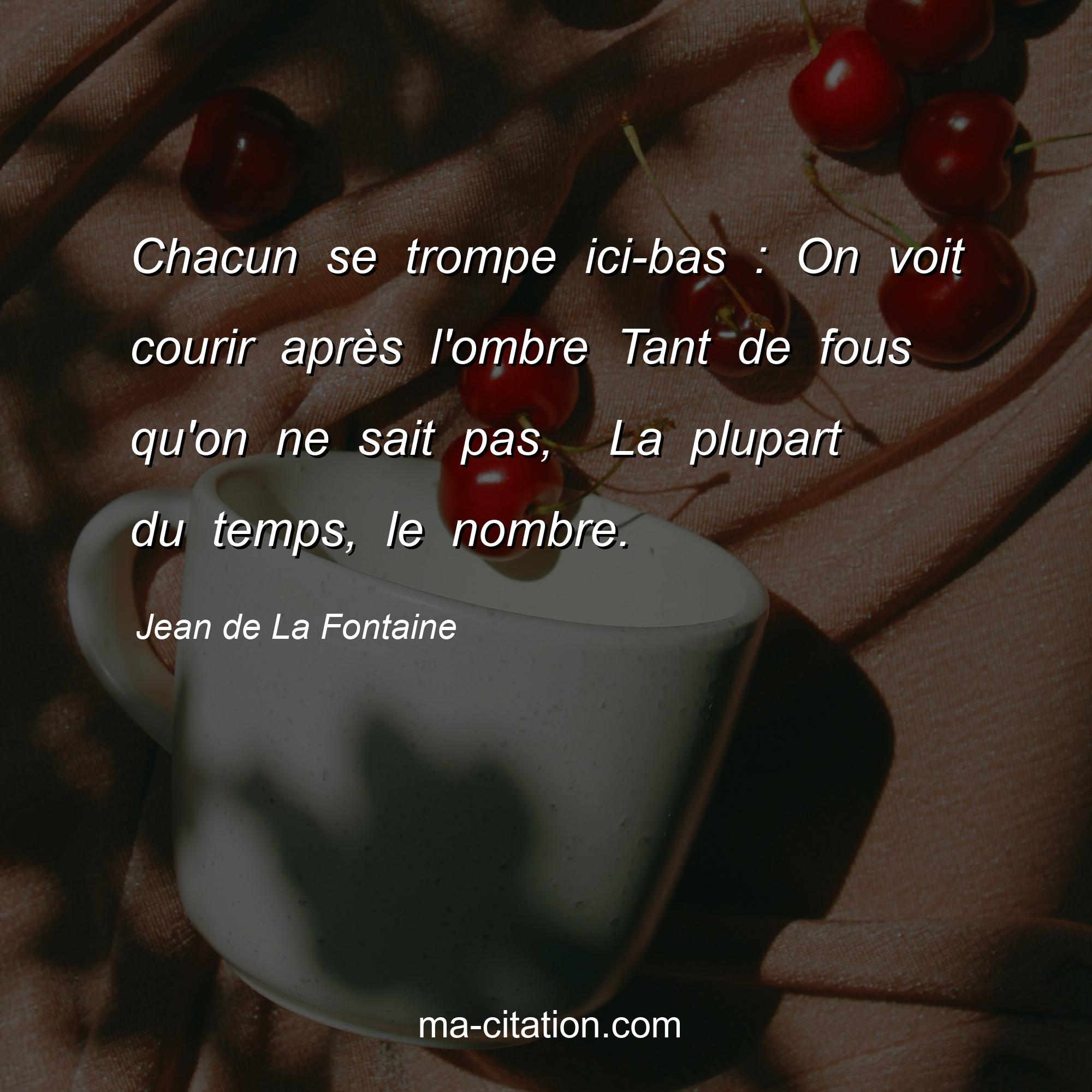Citation sur la vie de Jean de La Fontaine :Chacun se trompe ici-bas : On voit courir après l'ombre Tant de fous qu'on ne sait pas, La plupart du temps, le nombre.