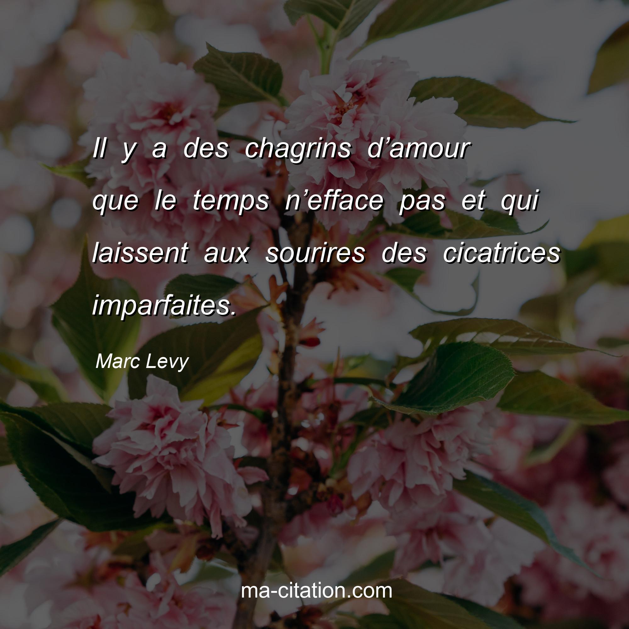 Citation sur la vie de Marc Levy :Il y a des chagrins d’amour que le temps n’efface pas et qui laissent aux sourires des cicatrices imparfaites.