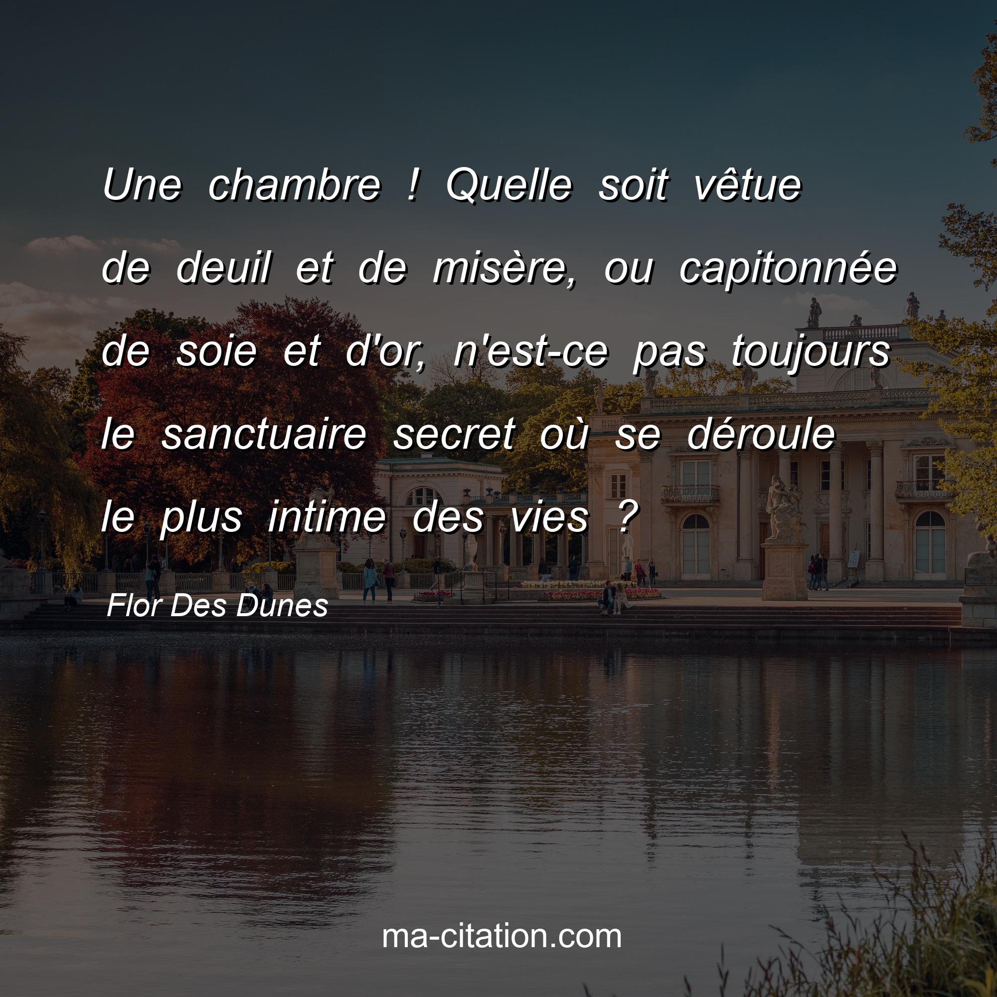 Flor Des Dunes est l'auteur de la citation sur la vie "Une chambre ! Quelle soit vêtue de deuil et de misère, ou capitonnée de soie et d'or, n'est-ce pas toujours le sanctuaire secret où se déroule le plus intime des vies ?".