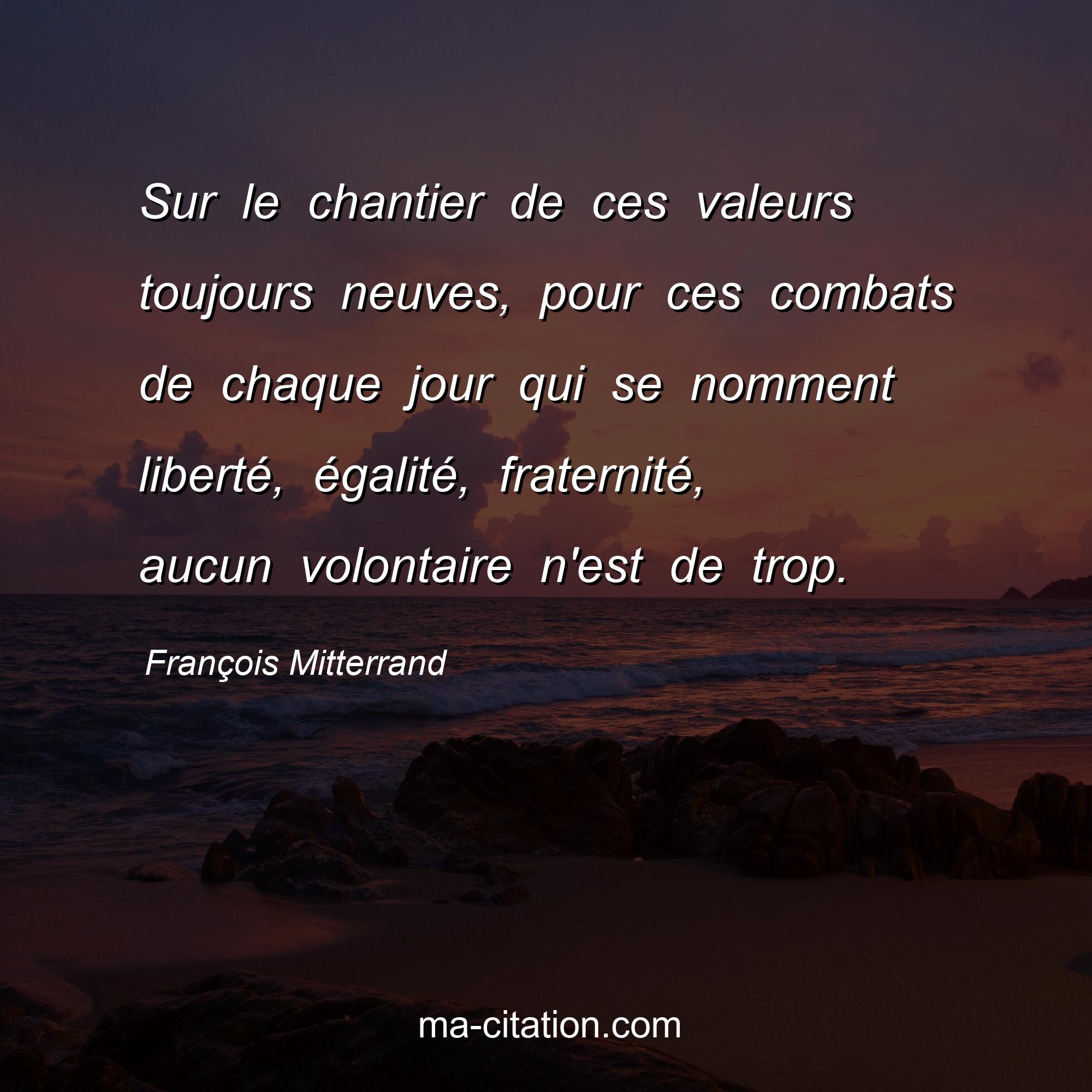 Citation sur la vie de François Mitterrand :Sur le chantier de ces valeurs toujours neuves, pour ces combats de chaque jour qui se nomment liberté, égalité, fraternité, aucun volontaire n'est de trop.