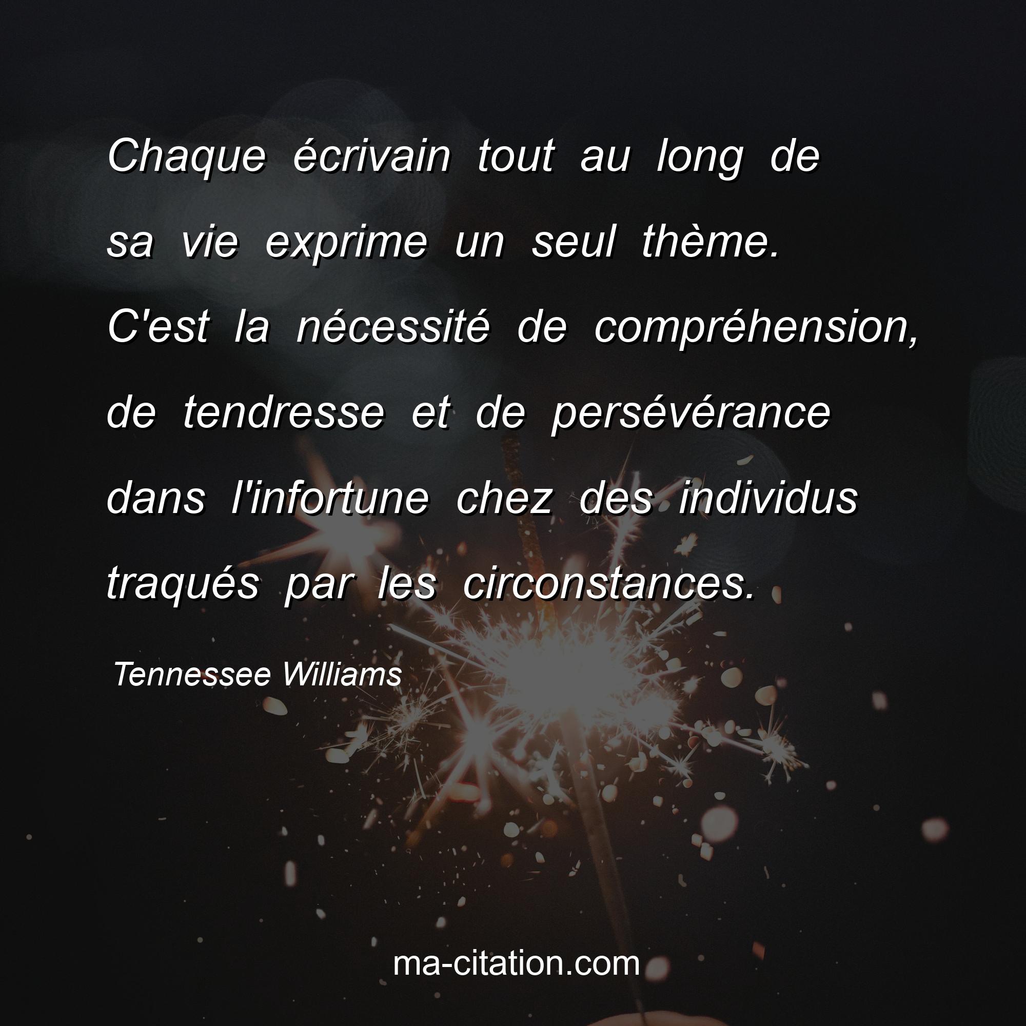 Tennessee Williams est l'auteur de la citation sur la vie "Chaque écrivain tout au long de sa vie exprime un seul thème. C'est la nécessité de compréhension, de tendresse et de persévérance dans l'infortune chez des individus traqués par les circonstances.".