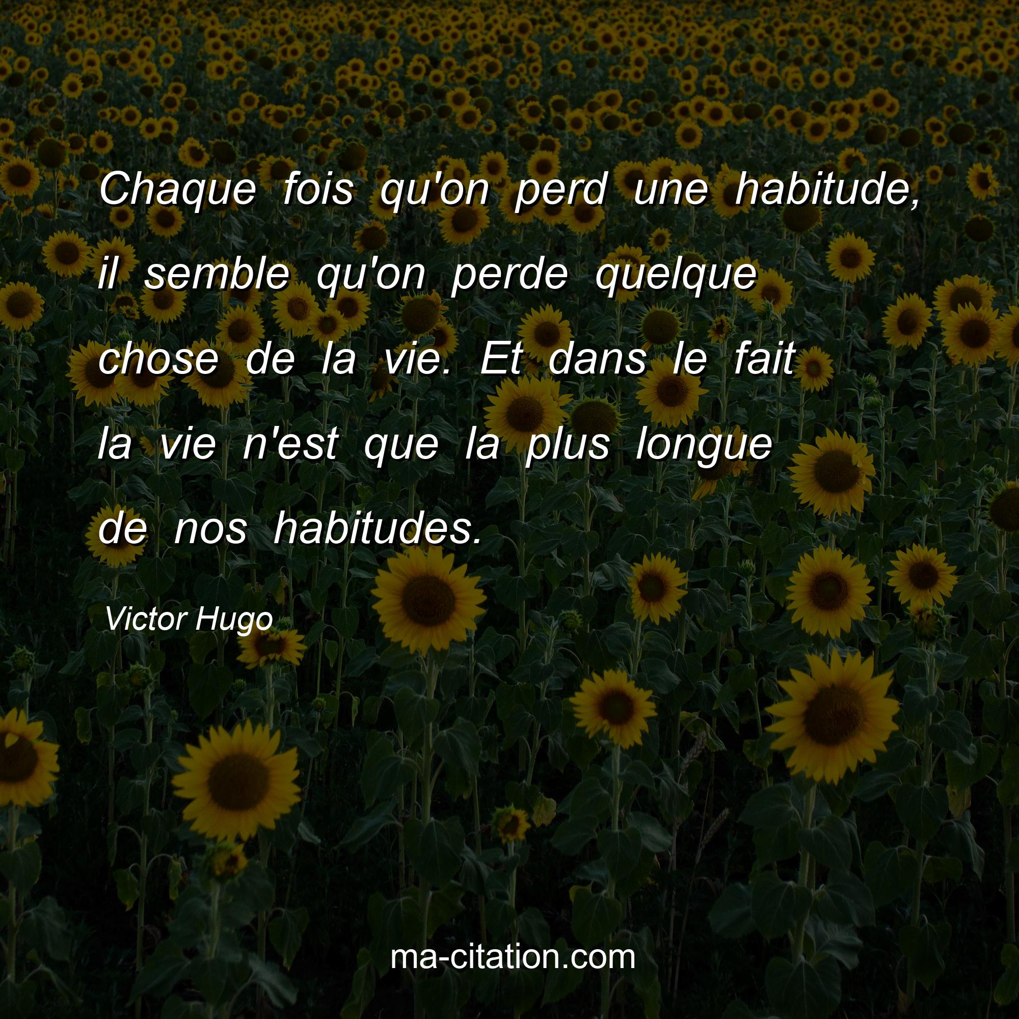Citation sur la vie de Victor Hugo :Chaque fois qu'on perd une habitude, il semble qu'on perde quelque chose de la vie. Et dans le fait la vie n'est que la plus longue de nos habitudes.