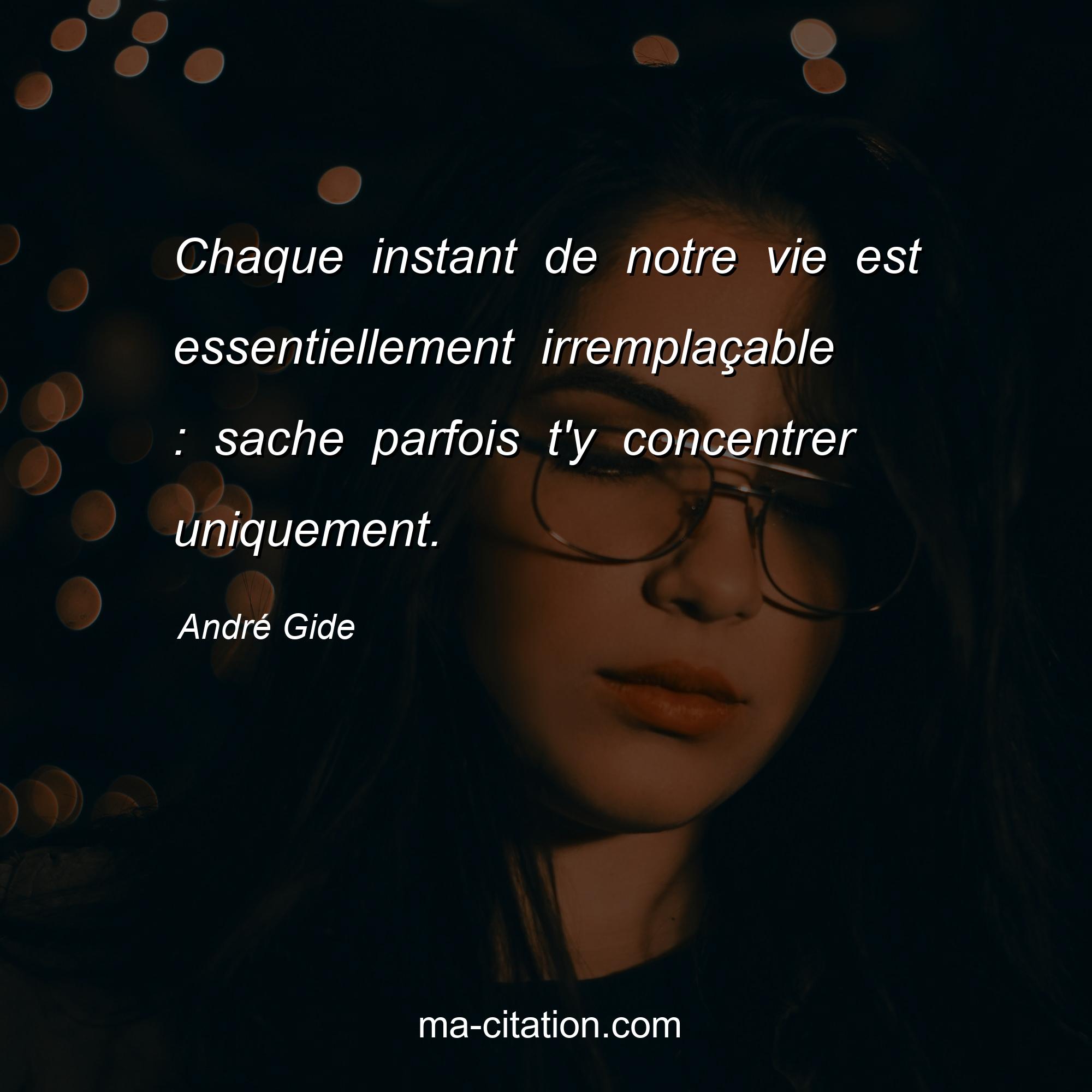 Citation sur la vie d'André Gide :Chaque instant de notre vie est essentiellement irremplaçable : sache parfois t'y concentrer uniquement.
