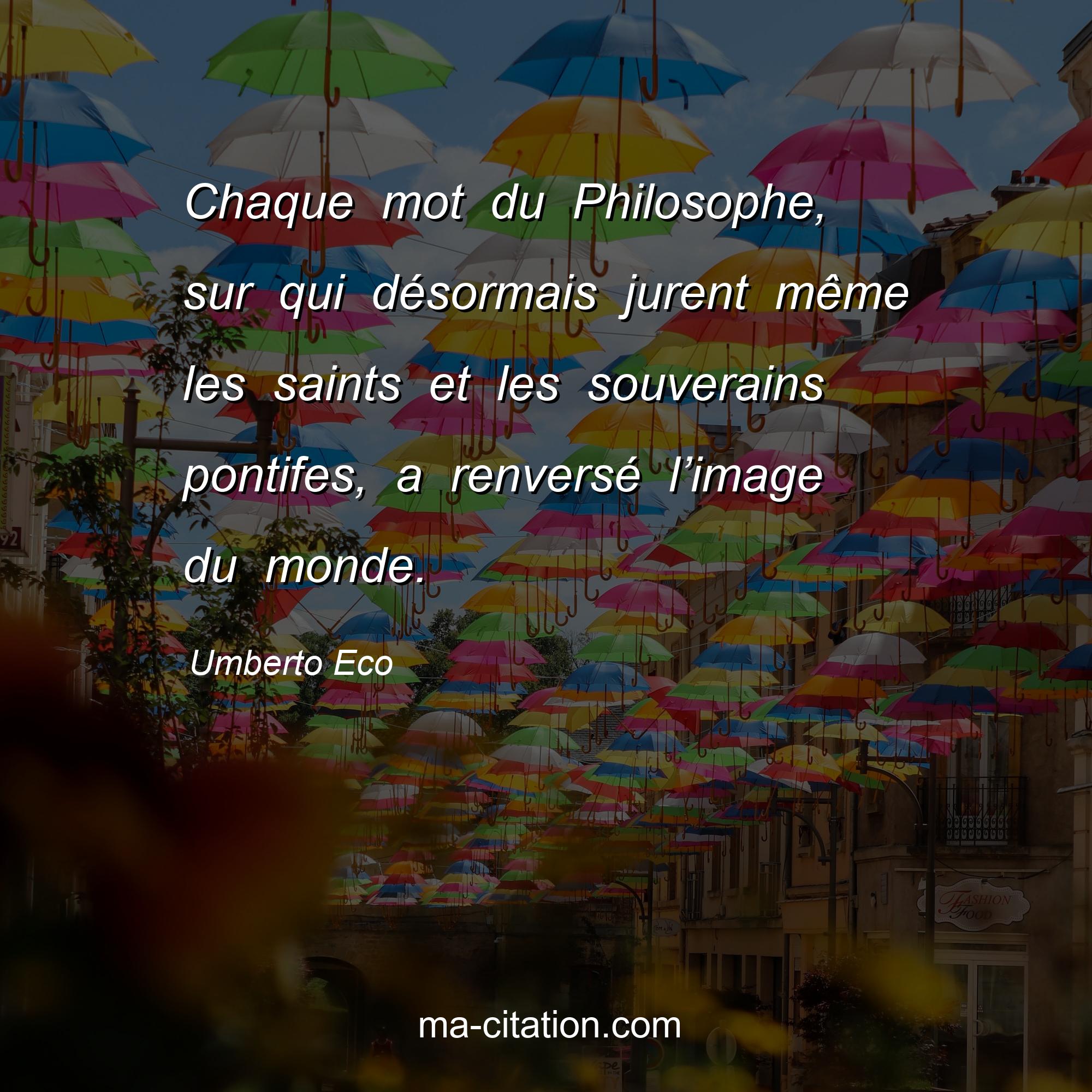 Citation sur la vie d'Umberto Eco :Chaque mot du Philosophe, sur qui désormais jurent même les saints et les souverains pontifes, a renversé l’image du monde.