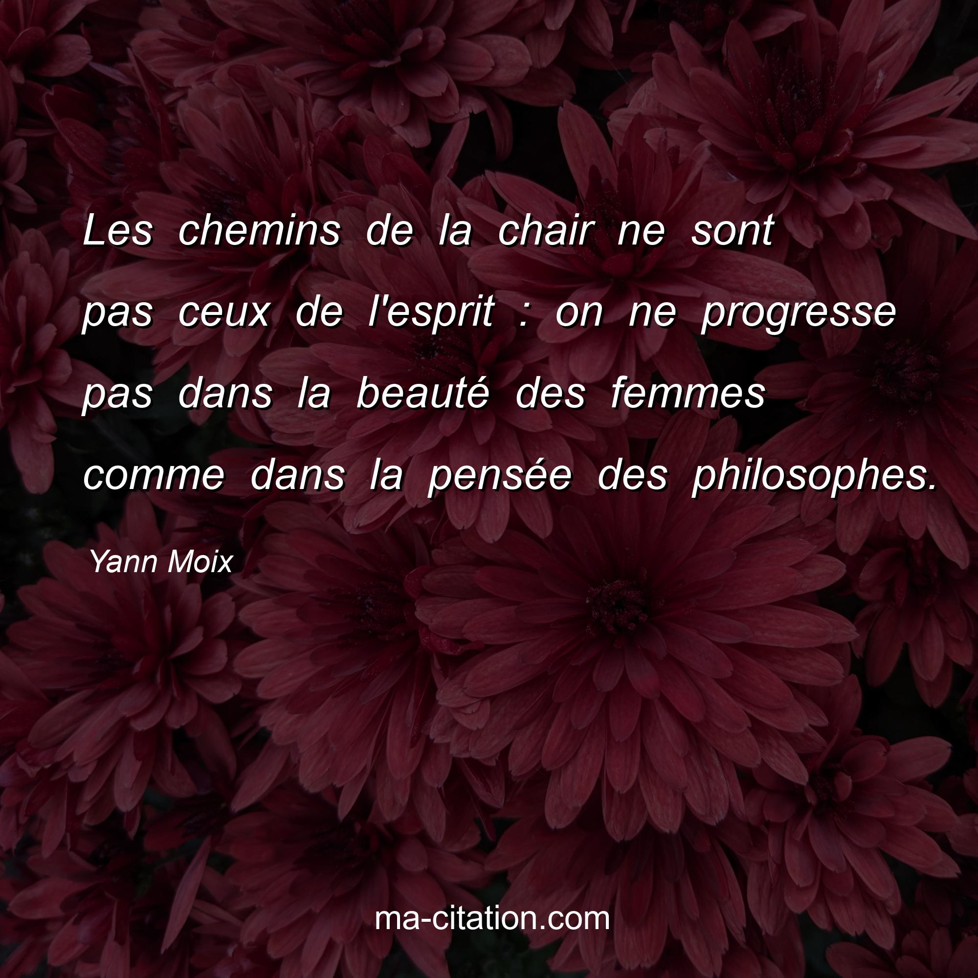Citation sur la vie de Yann Moix :Les chemins de la chair ne sont pas ceux de l'esprit : on ne progresse pas dans la beauté des femmes comme dans la pensée des philosophes.