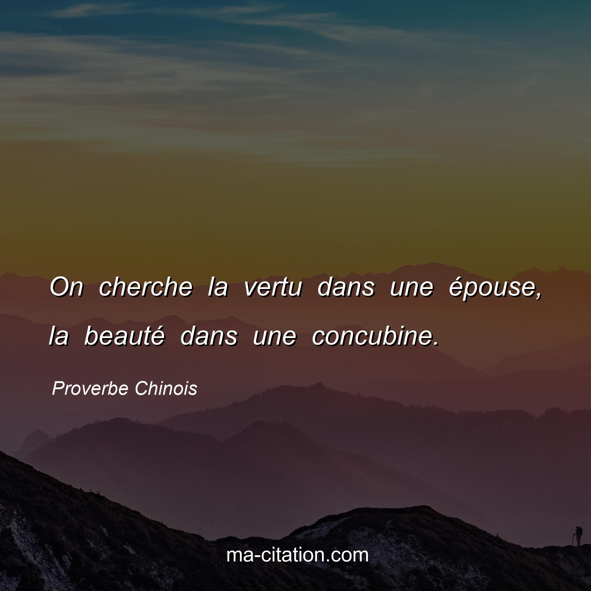 Proverbe Chinois sur la vie :On cherche la vertu dans une épouse, la beauté dans une concubine.
