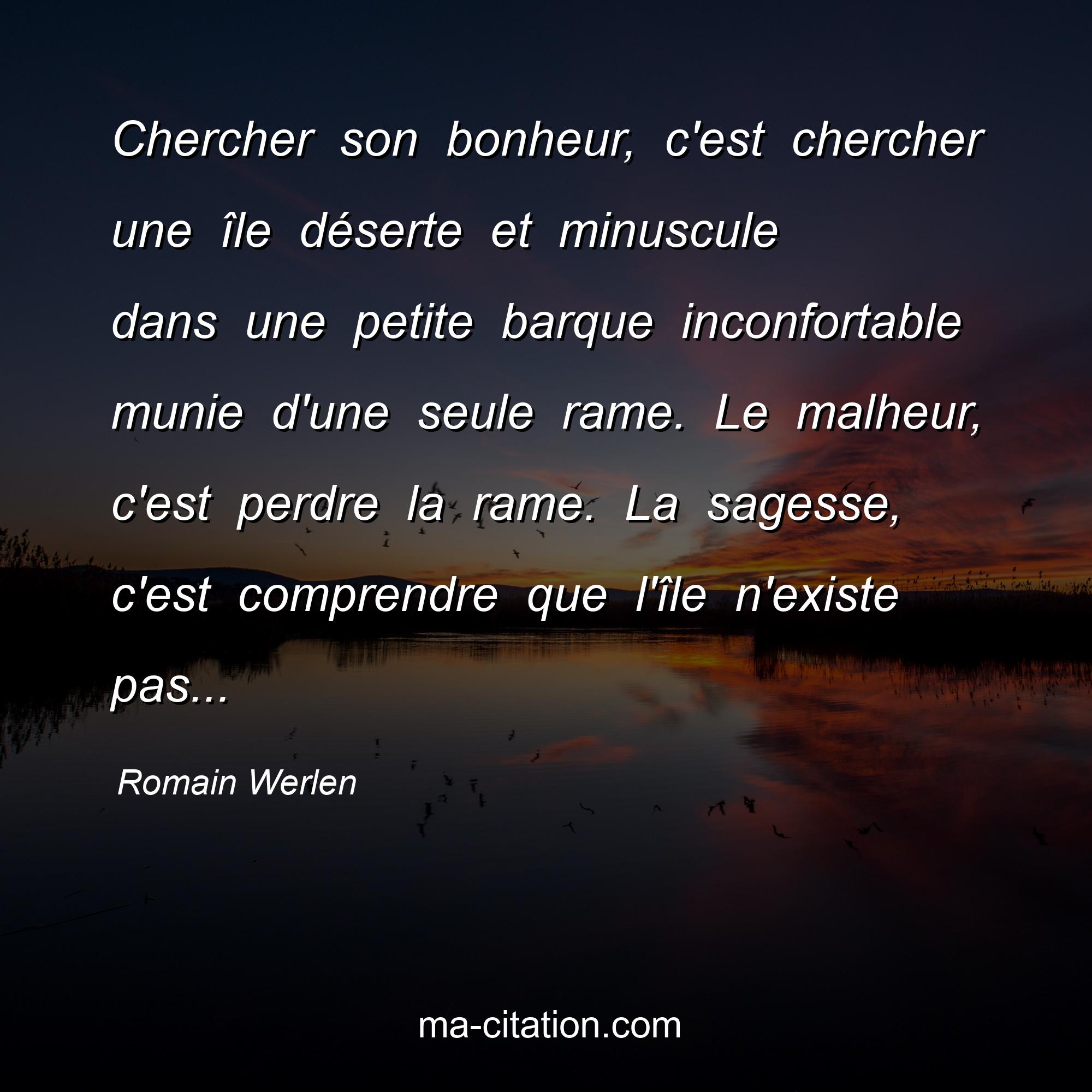 Romain Werlen est l'auteur de la citation sur la vie "Chercher son bonheur, c'est chercher une île déserte et minuscule dans une petite barque inconfortable munie d'une seule rame. Le malheur, c'est perdre la rame. La sagesse, c'est comprendre que l'île n'existe pas...".