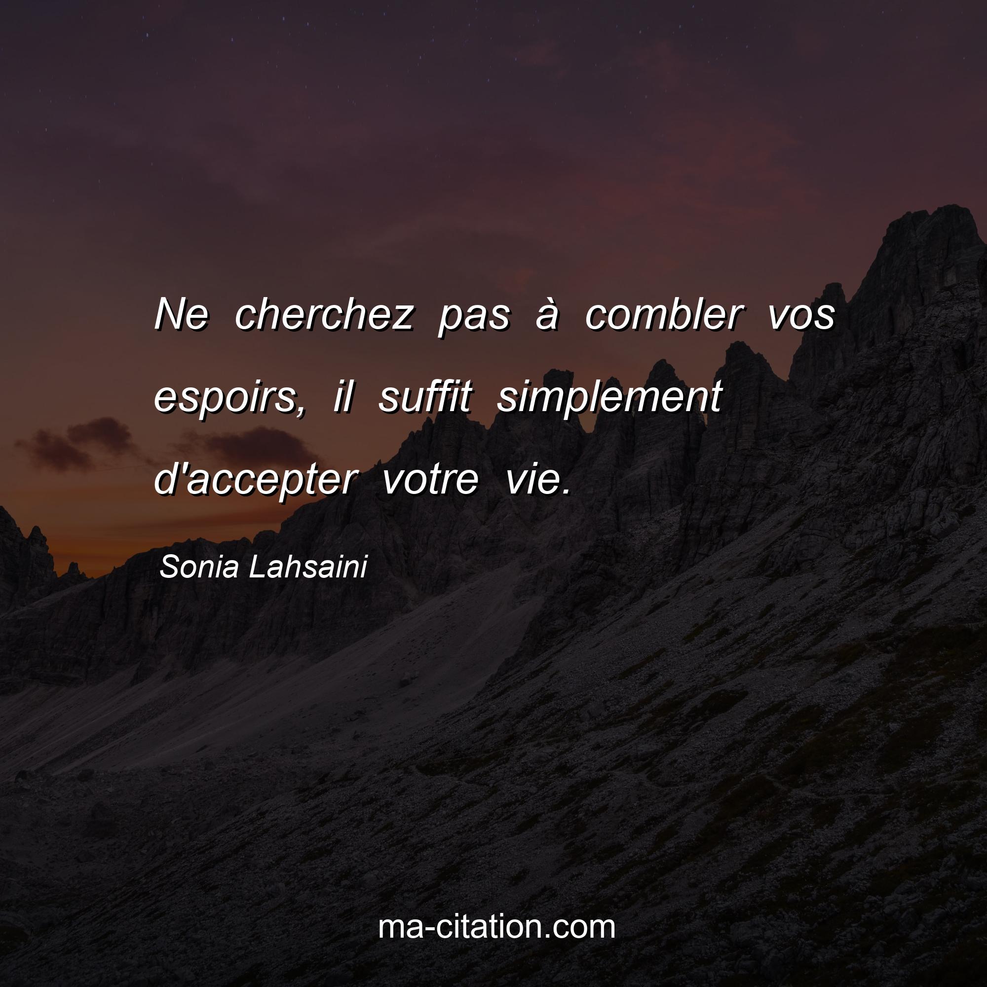 Citation sur la vie de Sonia Lahsaini :Ne cherchez pas à combler vos espoirs, il suffit simplement d'accepter votre vie.