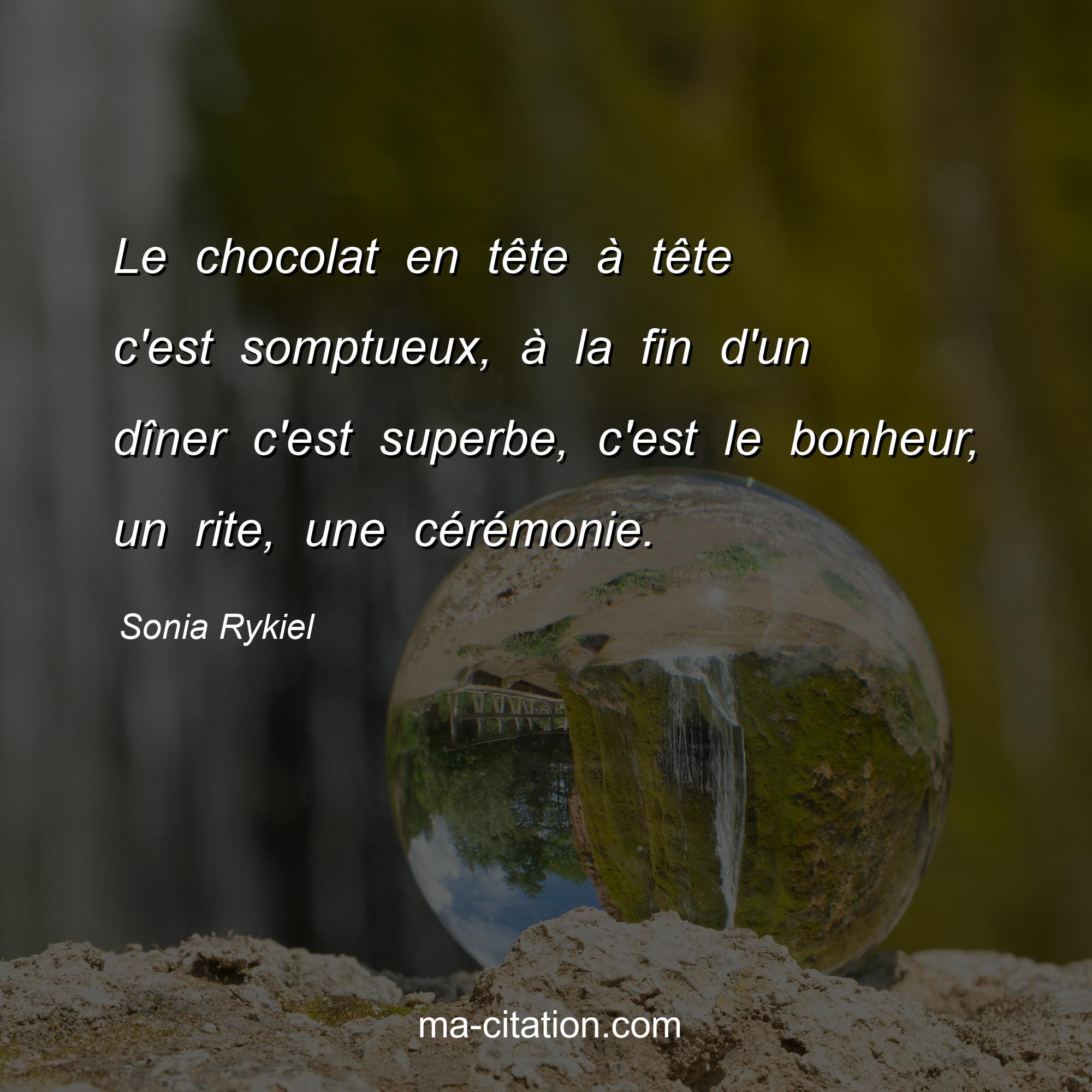 Citation sur la vie de Sonia Rykiel :Le chocolat en tête à tête c'est somptueux, à la fin d'un dîner c'est superbe, c'est le bonheur, un rite, une cérémonie.