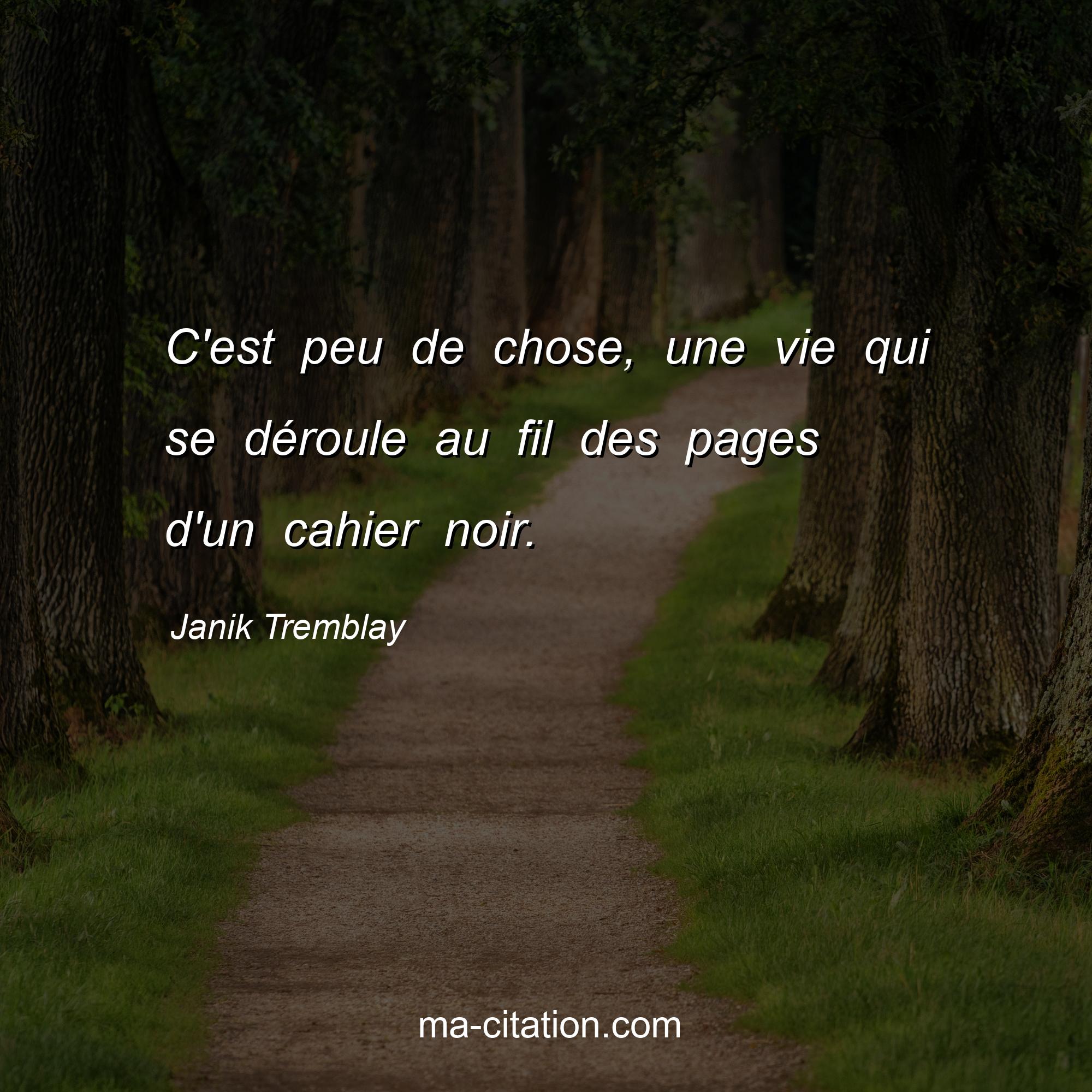 Janik Tremblay est l'auteur de la citation sur la vie "C'est peu de chose, une vie qui se déroule au fil des pages d'un cahier noir.".