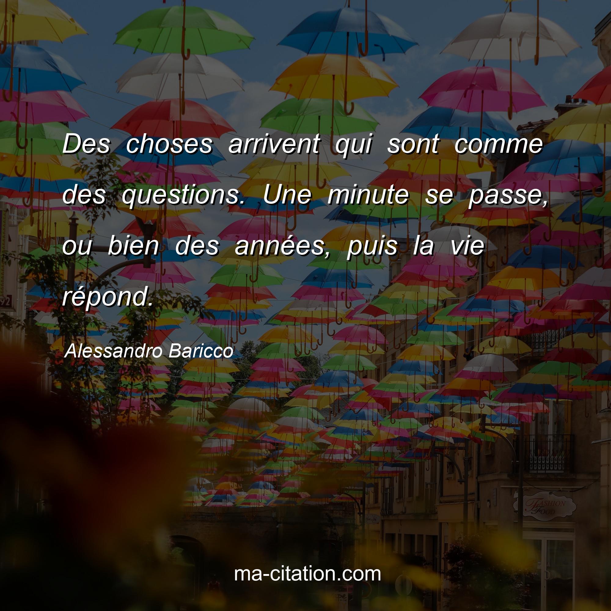 Citation sur la vie d'Alessandro Baricco :Des choses arrivent qui sont comme des questions. Une minute se passe, ou bien des années, puis la vie répond.