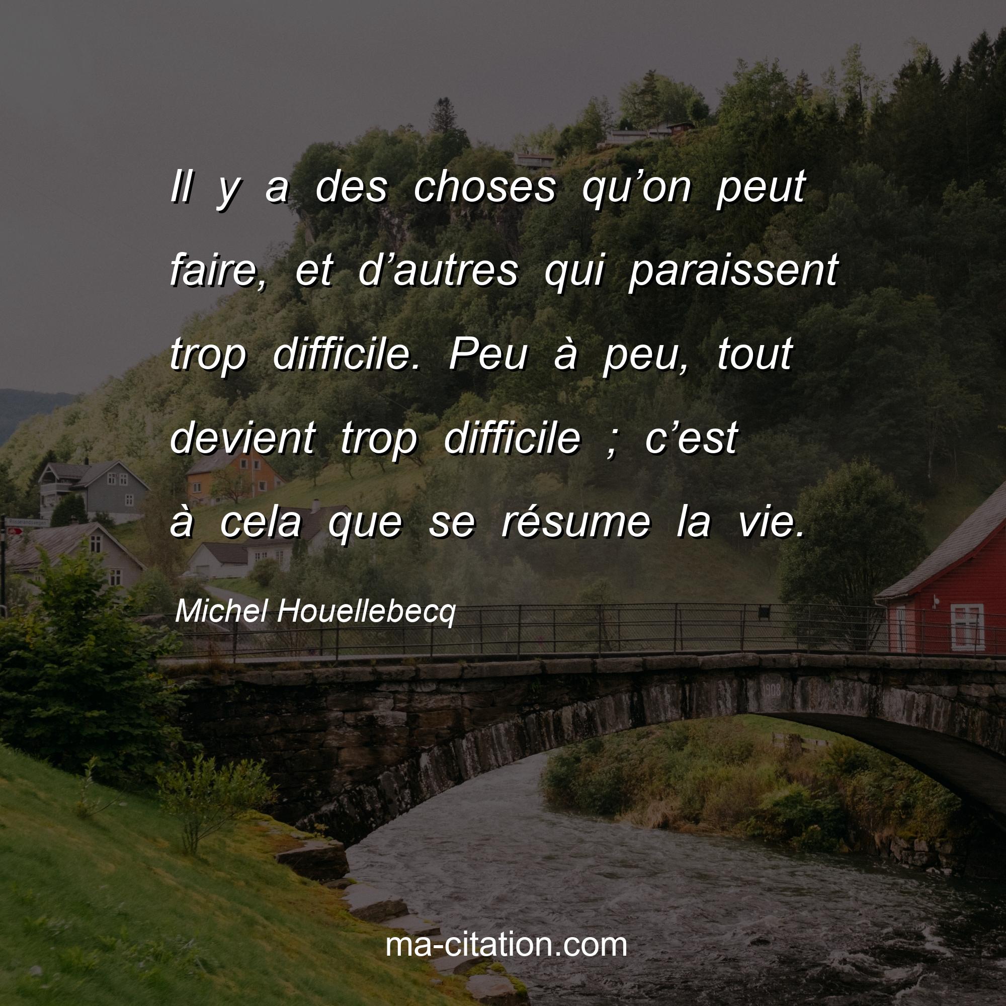 Citation sur la vie de Michel Houellebecq :Il y a des choses qu’on peut faire, et d’autres qui paraissent trop difficile. Peu à peu, tout devient trop difficile ; c’est à cela que se résume la vie.