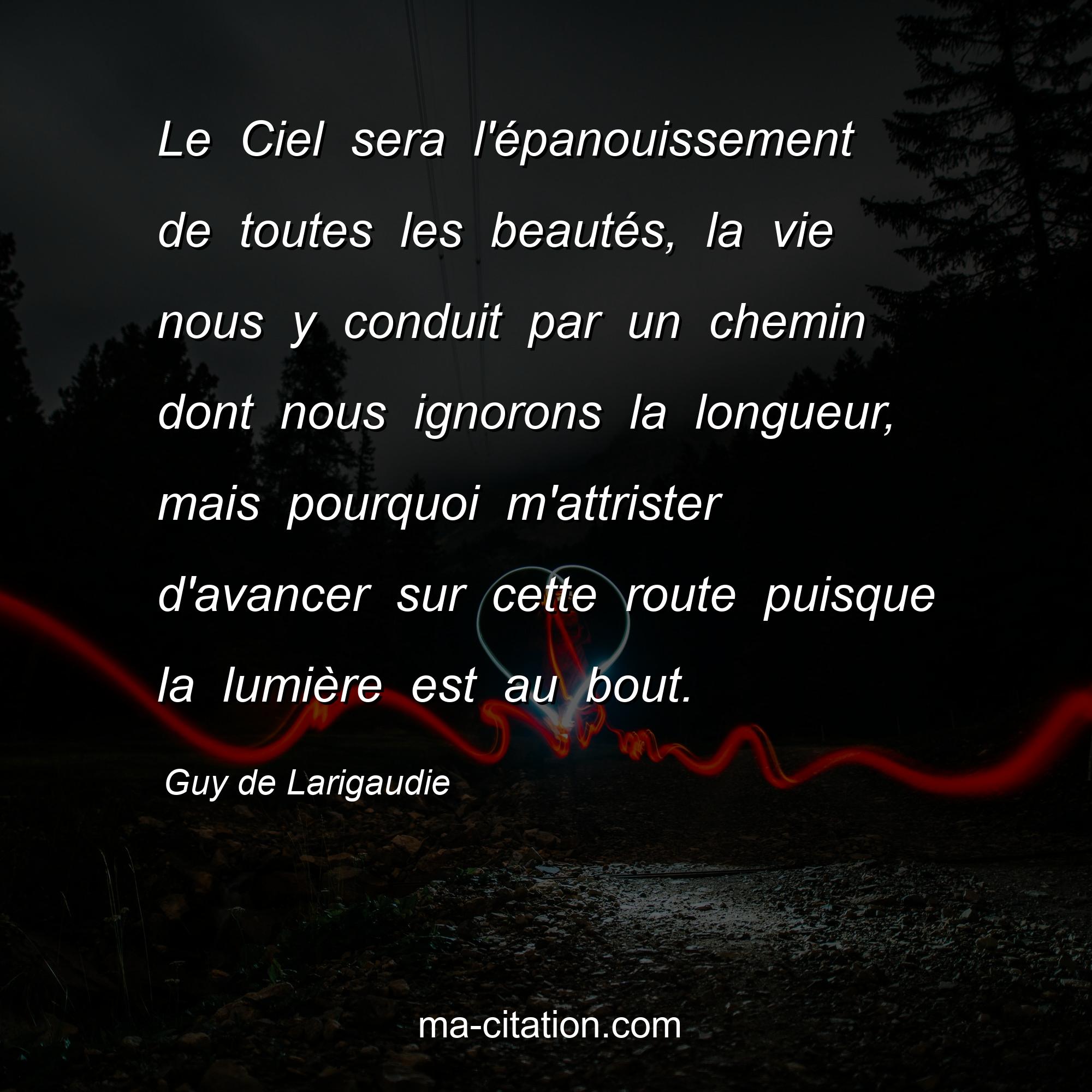 Citation sur la vie de Guy de Larigaudie :Le Ciel sera l'épanouissement de toutes les beautés, la vie nous y conduit par un chemin dont nous ignorons la longueur, mais pourquoi m'attrister d'avancer sur cette route puisque la lumière est au bout.