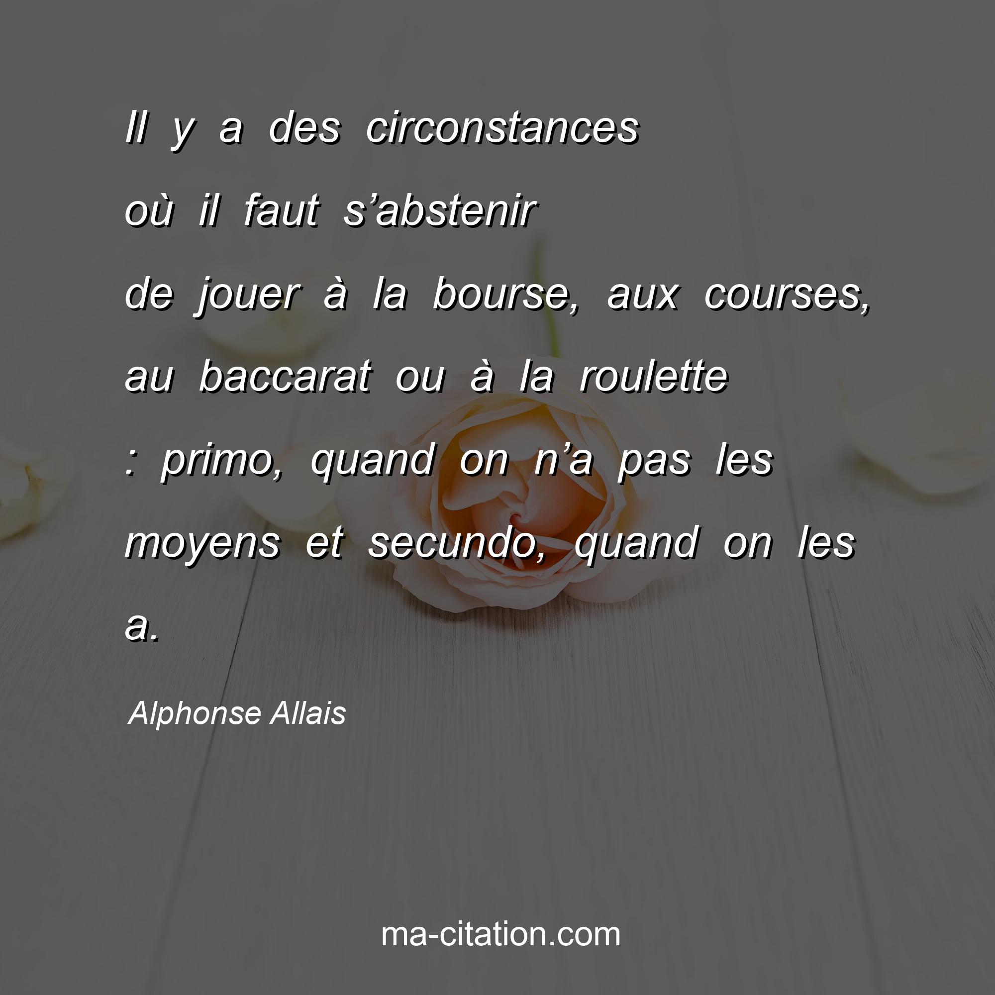 Citation sur la vie d'Alphonse Allais :Il y a des circonstances où il faut s’abstenir de jouer à la bourse, aux courses, au baccarat ou à la roulette : primo, quand on n’a pas les moyens et secundo, quand on les a.