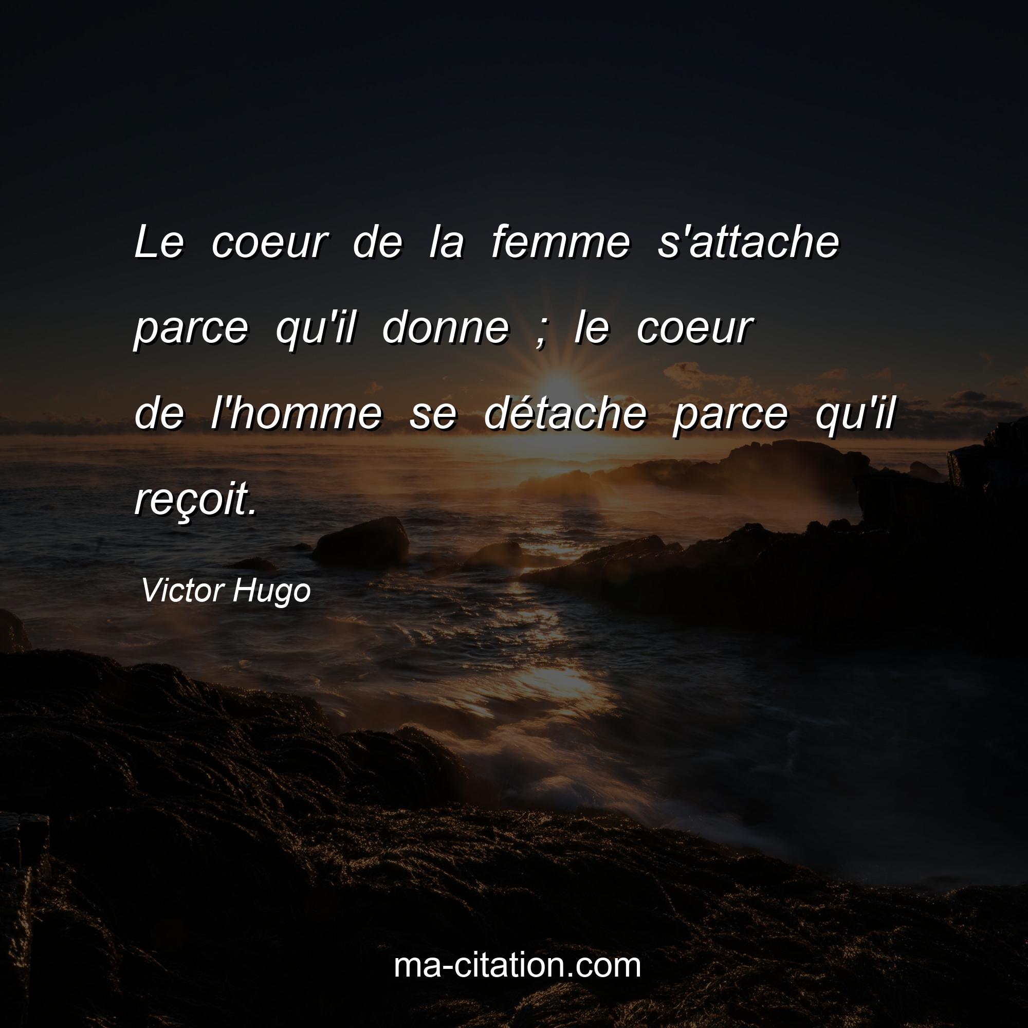 Citation sur la vie de Victor Hugo :Le coeur de la femme s'attache parce qu'il donne ; le coeur de l'homme se détache parce qu'il reçoit.