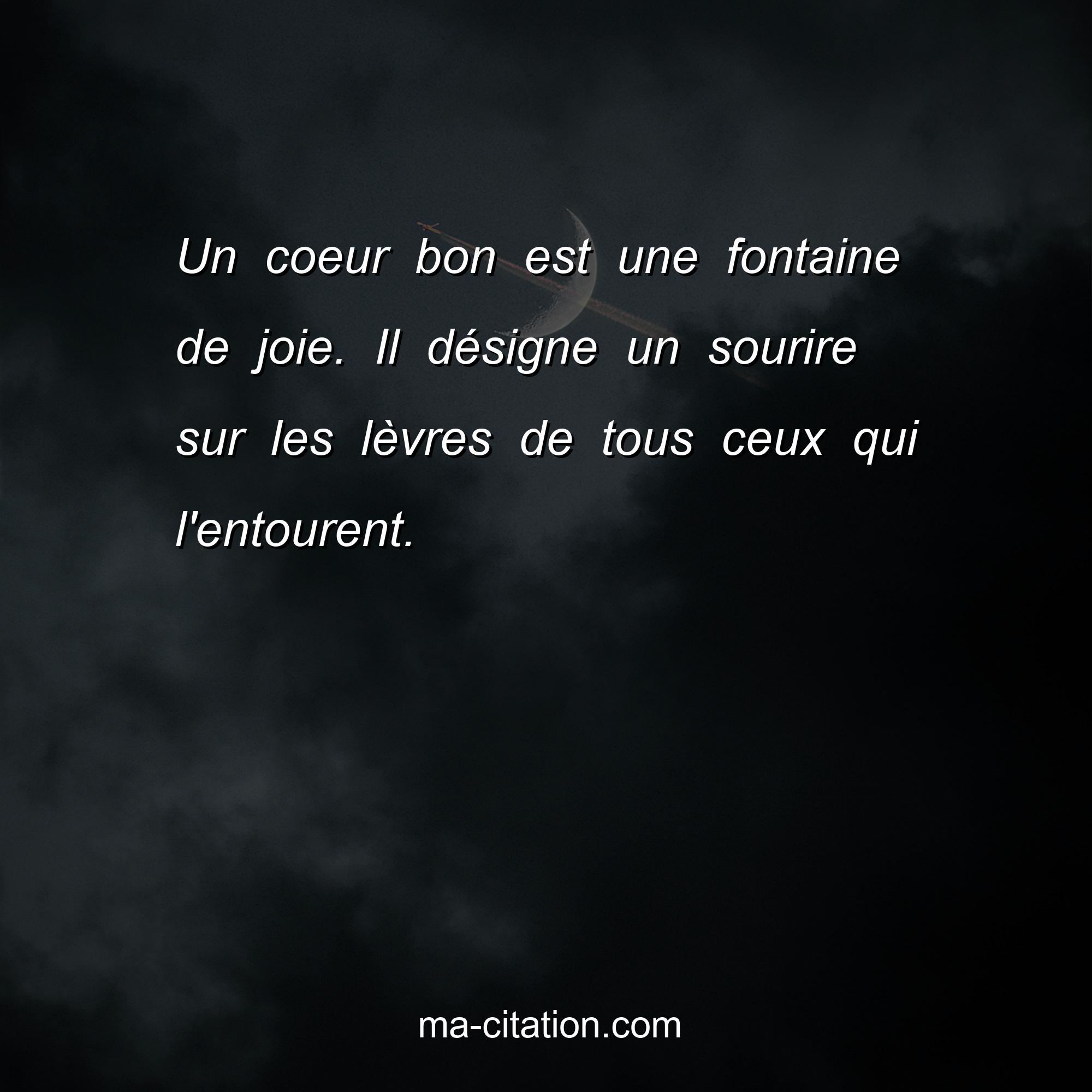 Citation sur la vie :Un coeur bon est une fontaine de joie. Il désigne un sourire sur les lèvres de tous ceux qui l'entourent.
