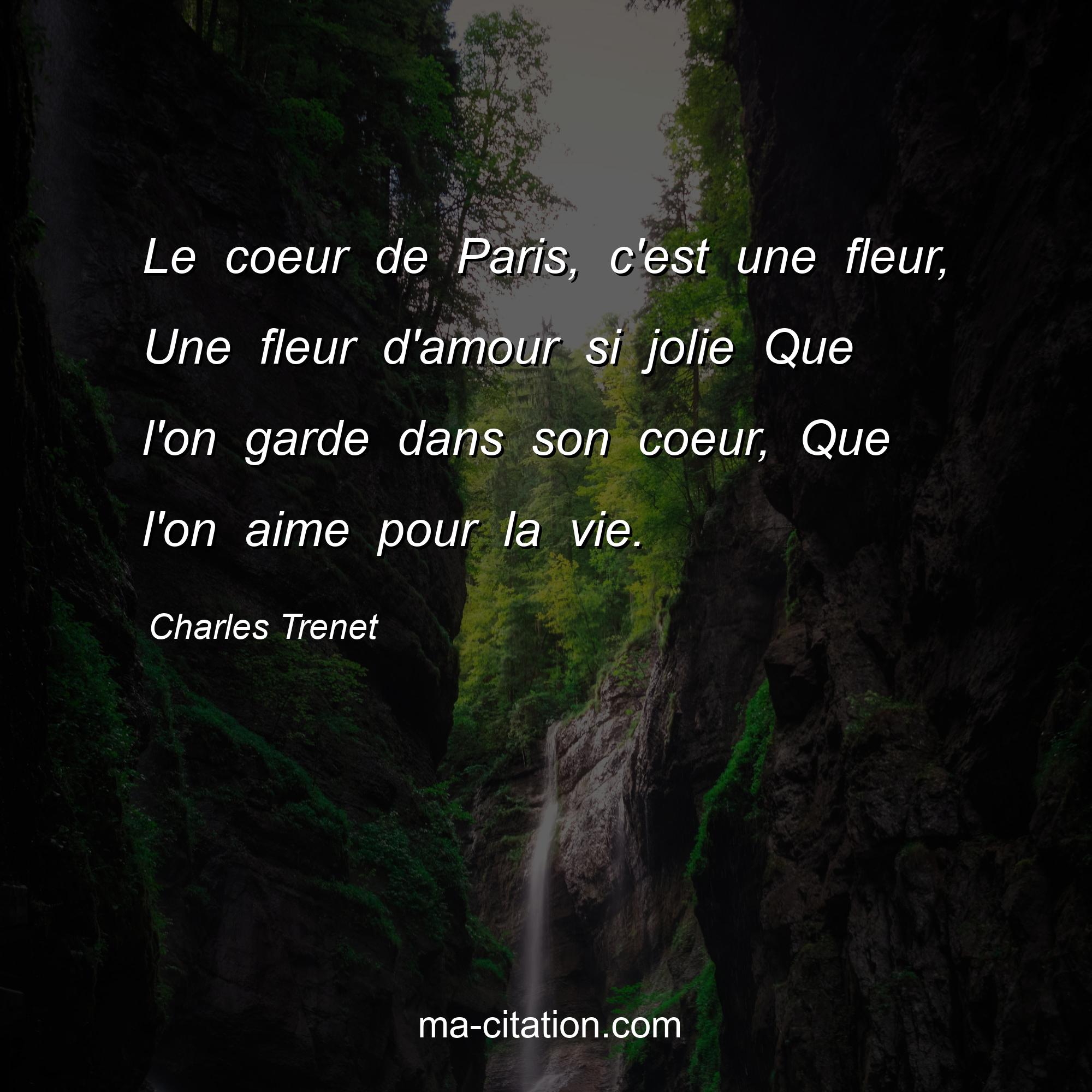Citation sur la vie de Charles Trenet :Le coeur de Paris, c'est une fleur, Une fleur d'amour si jolie Que l'on garde dans son coeur, Que l'on aime pour la vie.