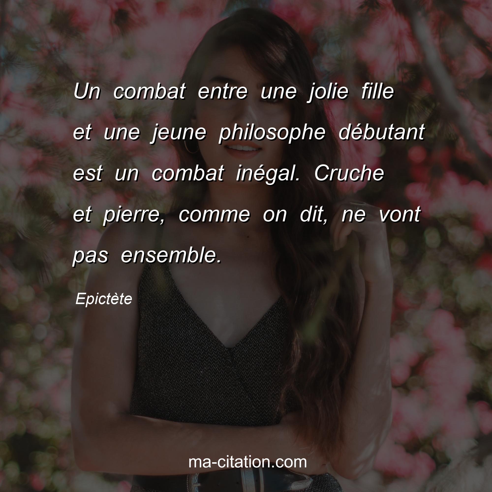 Epictète est l'auteur de la citation sur la vie "Un combat entre une jolie fille et une jeune philosophe débutant est un combat inégal. Cruche et pierre, comme on dit, ne vont pas ensemble.".