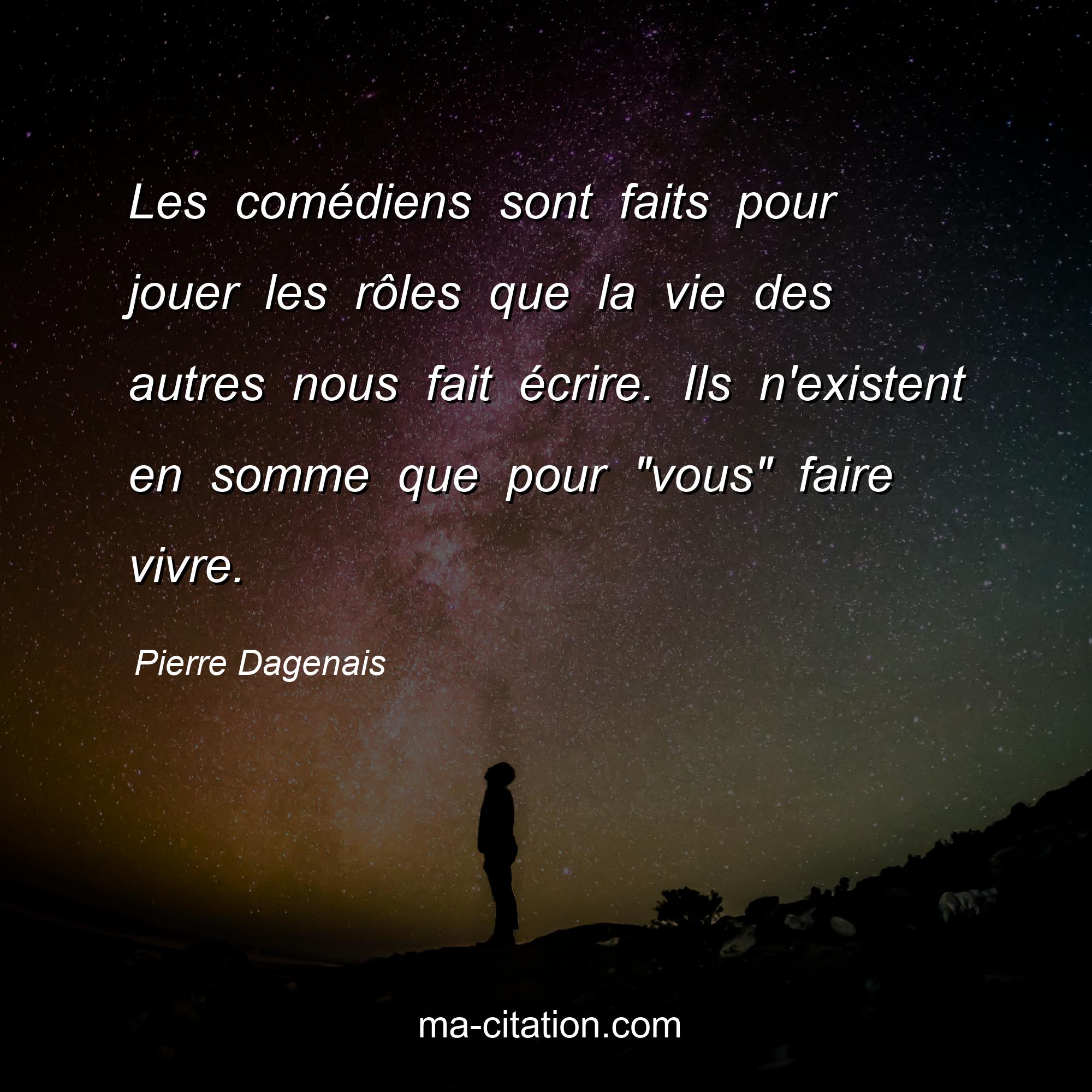 Citation sur la vie de Pierre Dagenais :Les comédiens sont faits pour jouer les rôles que la vie des autres nous fait écrire. Ils n'existent en somme que pour "vous" faire vivre.