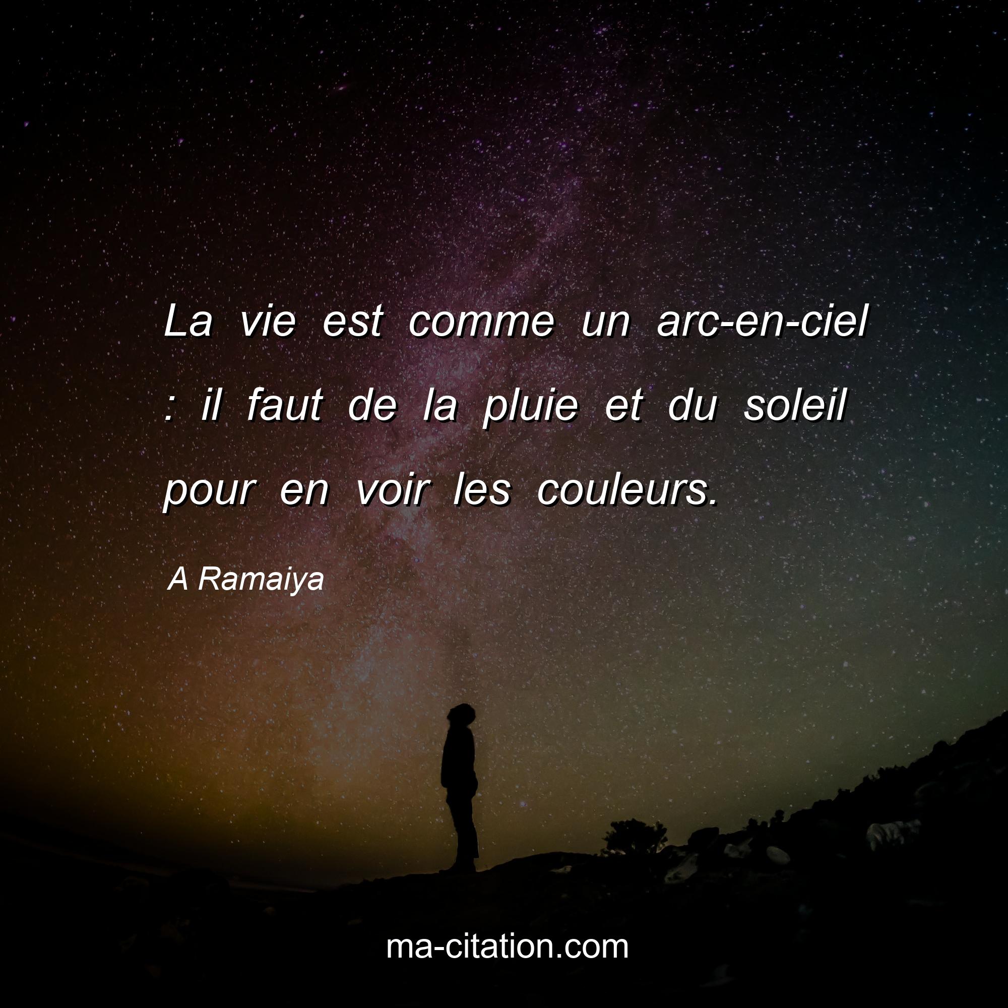 A Ramaiya est l'auteur de la citation sur la vie "La vie est comme un arc-en-ciel : il faut de la pluie et du soleil pour en voir les couleurs.".