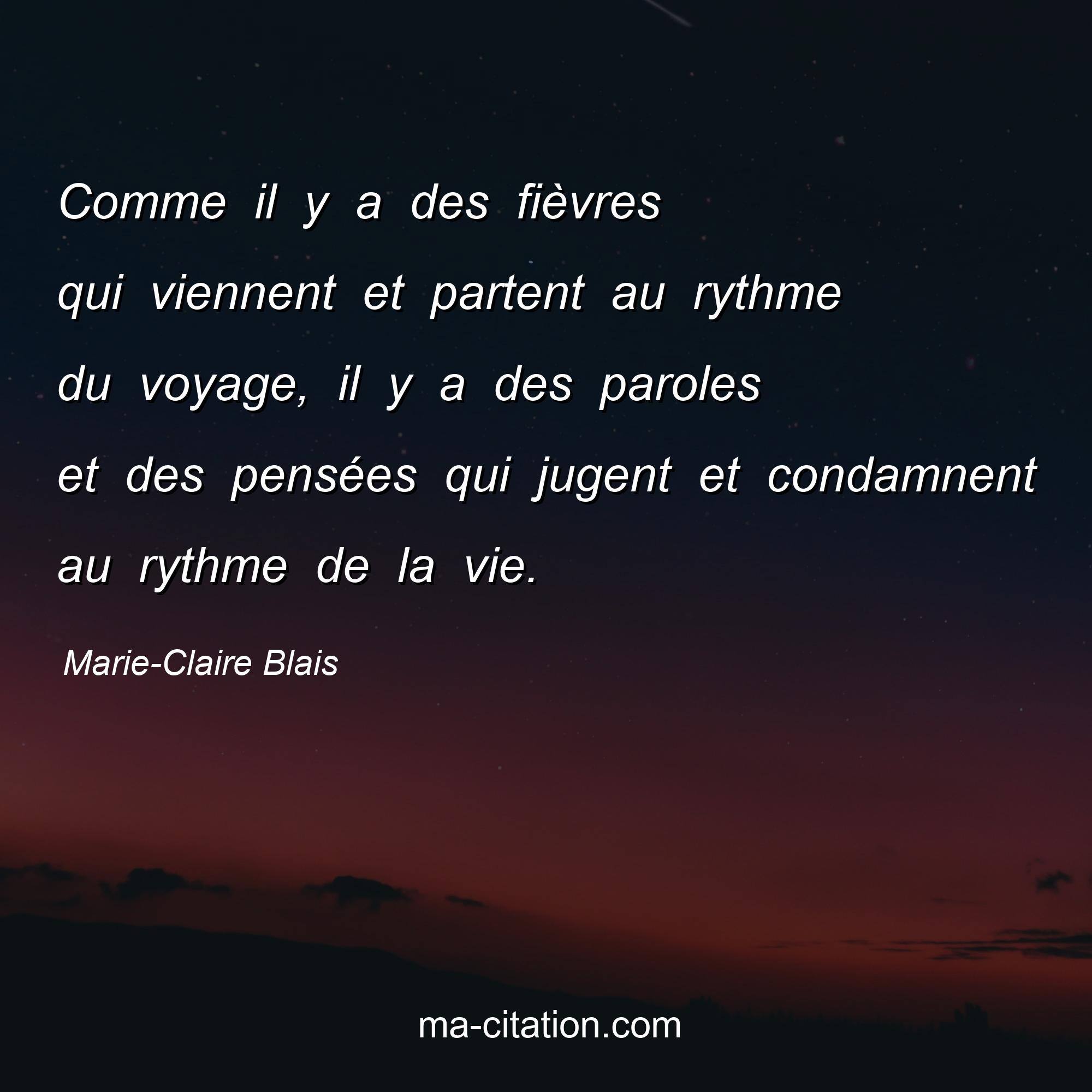 Citation sur la vie de Marie-Claire Blais :Comme il y a des fièvres qui viennent et partent au rythme du voyage, il y a des paroles et des pensées qui jugent et condamnent au rythme de la vie.