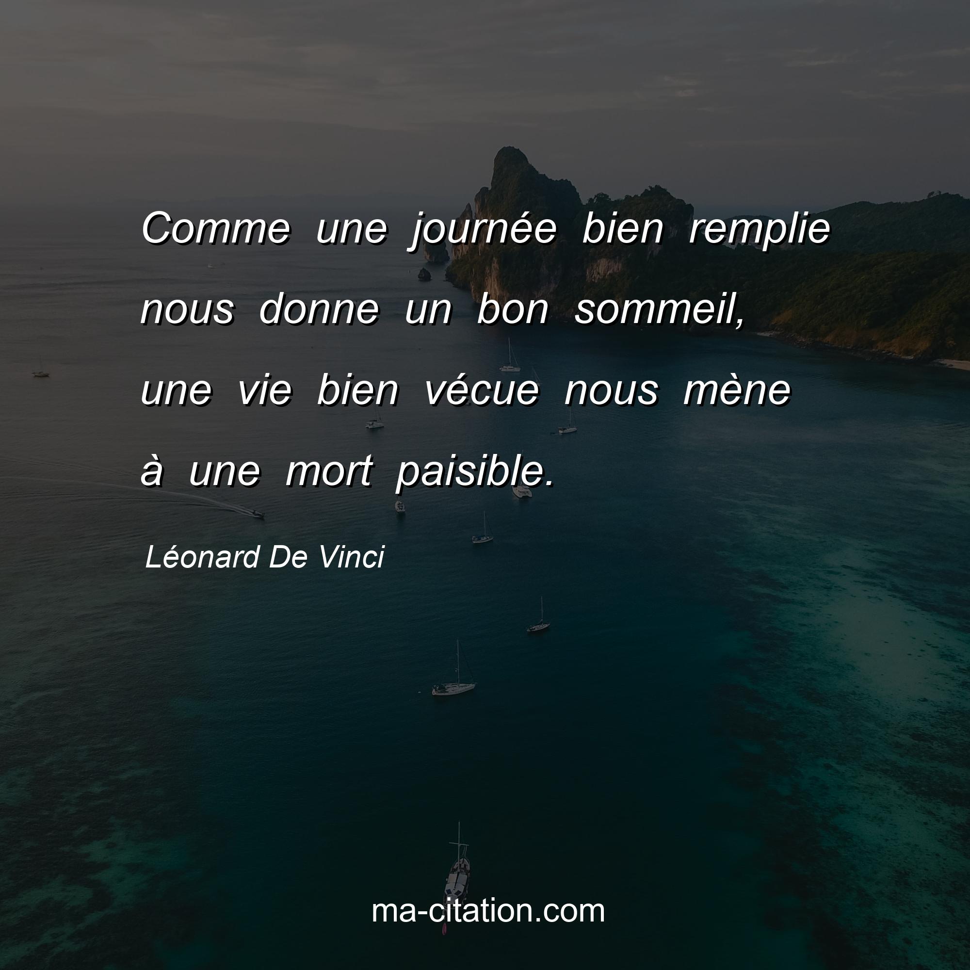 Citation sur la vie de Léonard De Vinci :Comme une journée bien remplie nous donne un bon sommeil, une vie bien vécue nous mène à une mort paisible.