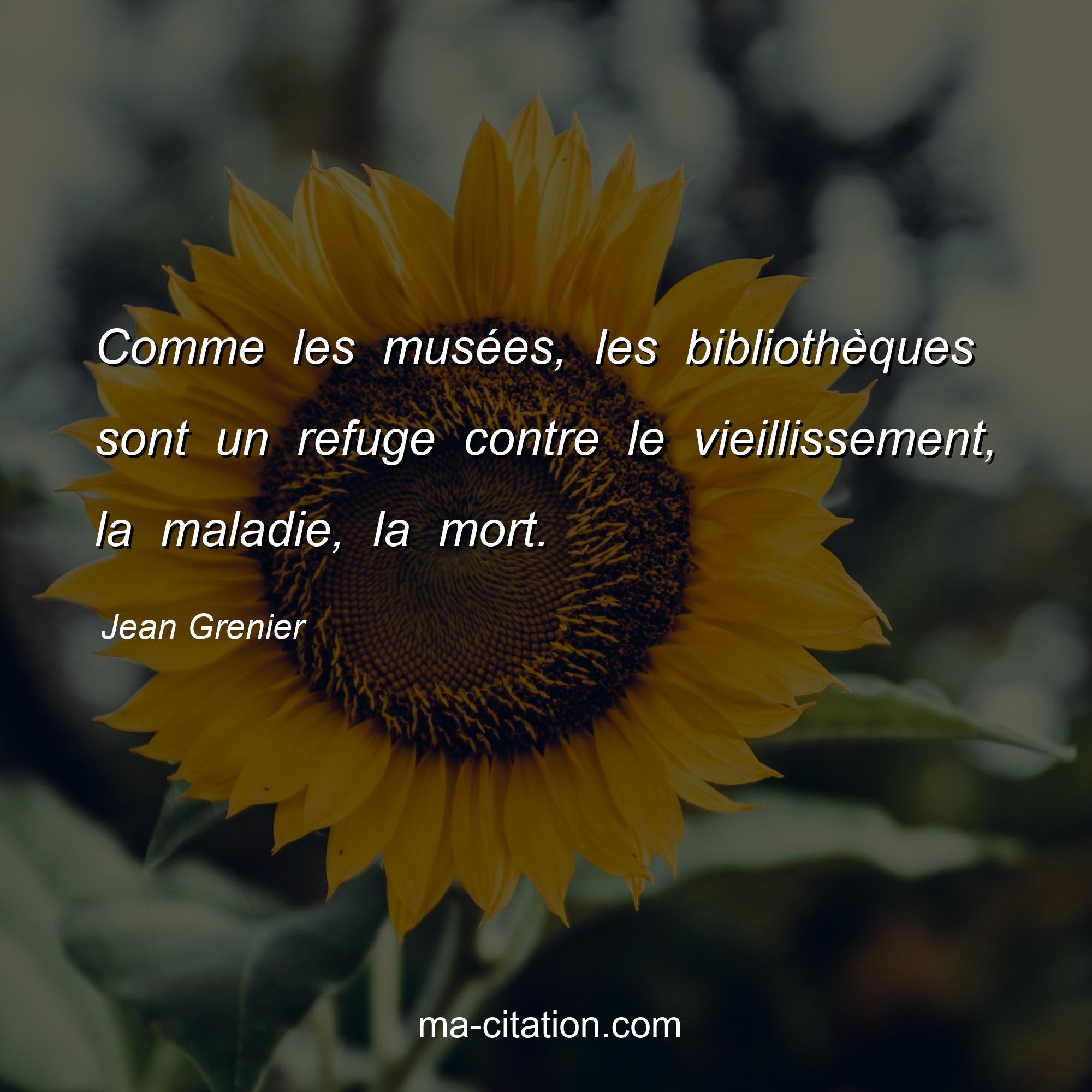 Jean Grenier est l'auteur de la citation sur la vie "Comme les musées, les bibliothèques sont un refuge contre le vieillissement, la maladie, la mort.".