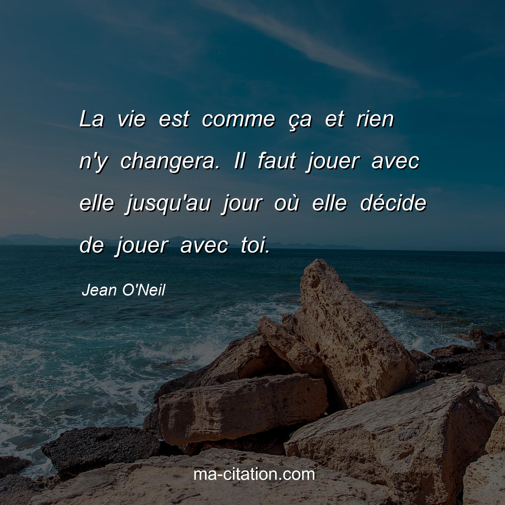 Citation sur la vie de Jean O'Neil :La vie est comme ça et rien n'y changera. Il faut jouer avec elle jusqu'au jour où elle décide de jouer avec toi.