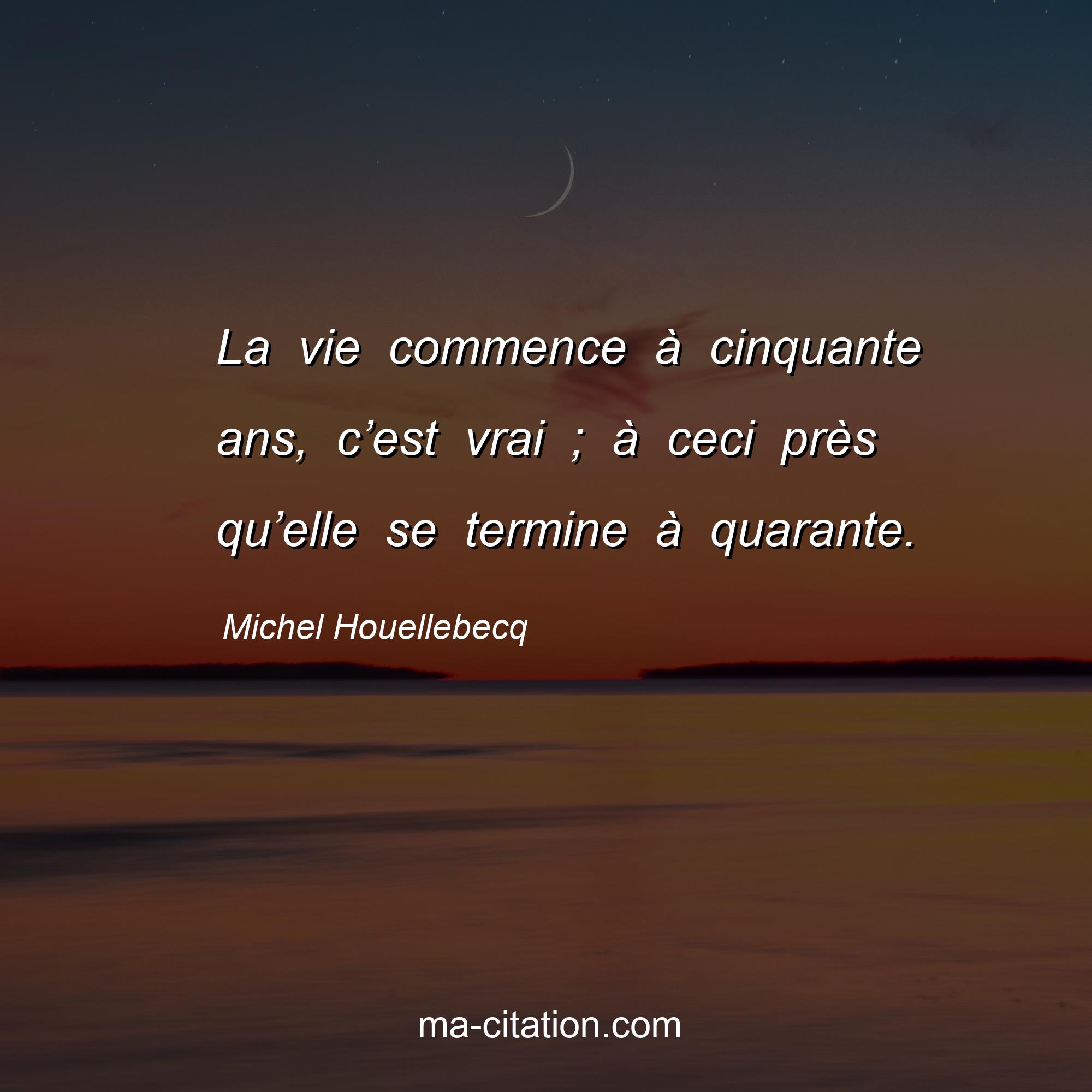 Citation sur la vie de Michel Houellebecq :La vie commence à cinquante ans, c’est vrai ; à ceci près qu’elle se termine à quarante.