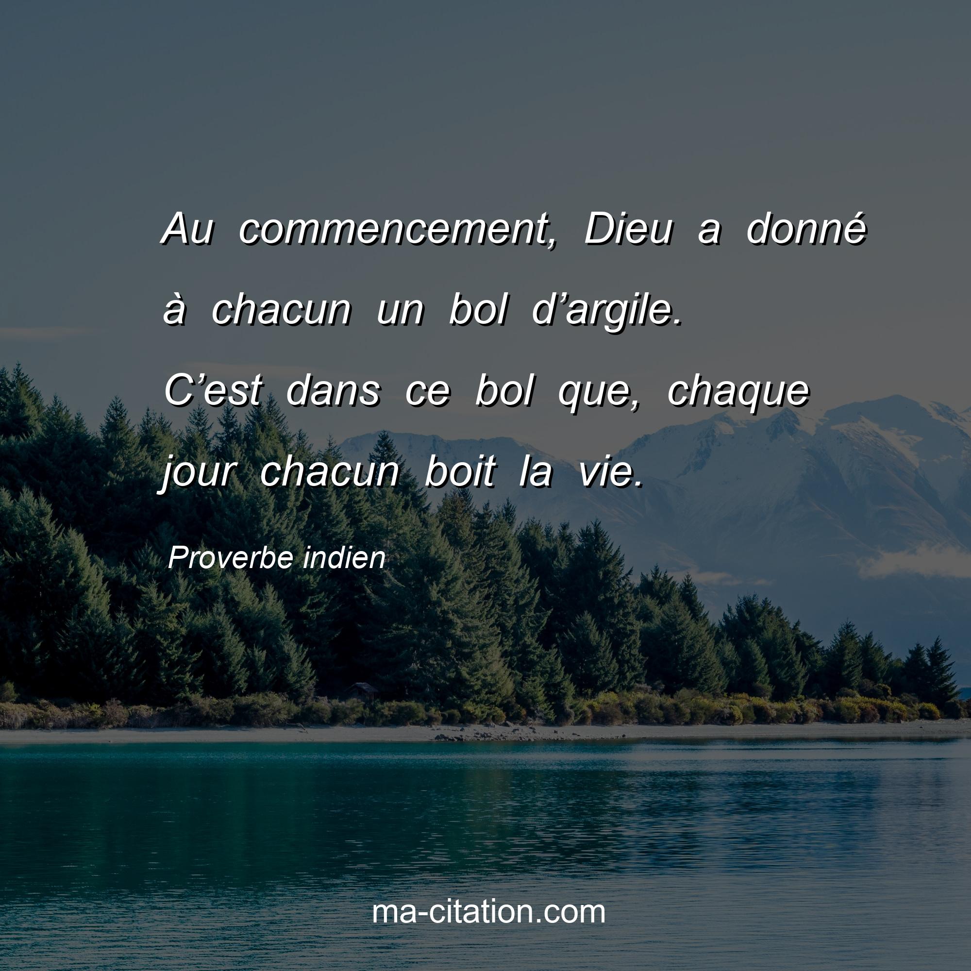 Proverbe indien sur la vie :Au commencement, Dieu a donné à chacun un bol d’argile. C’est dans ce bol que, chaque jour chacun boit la vie.
