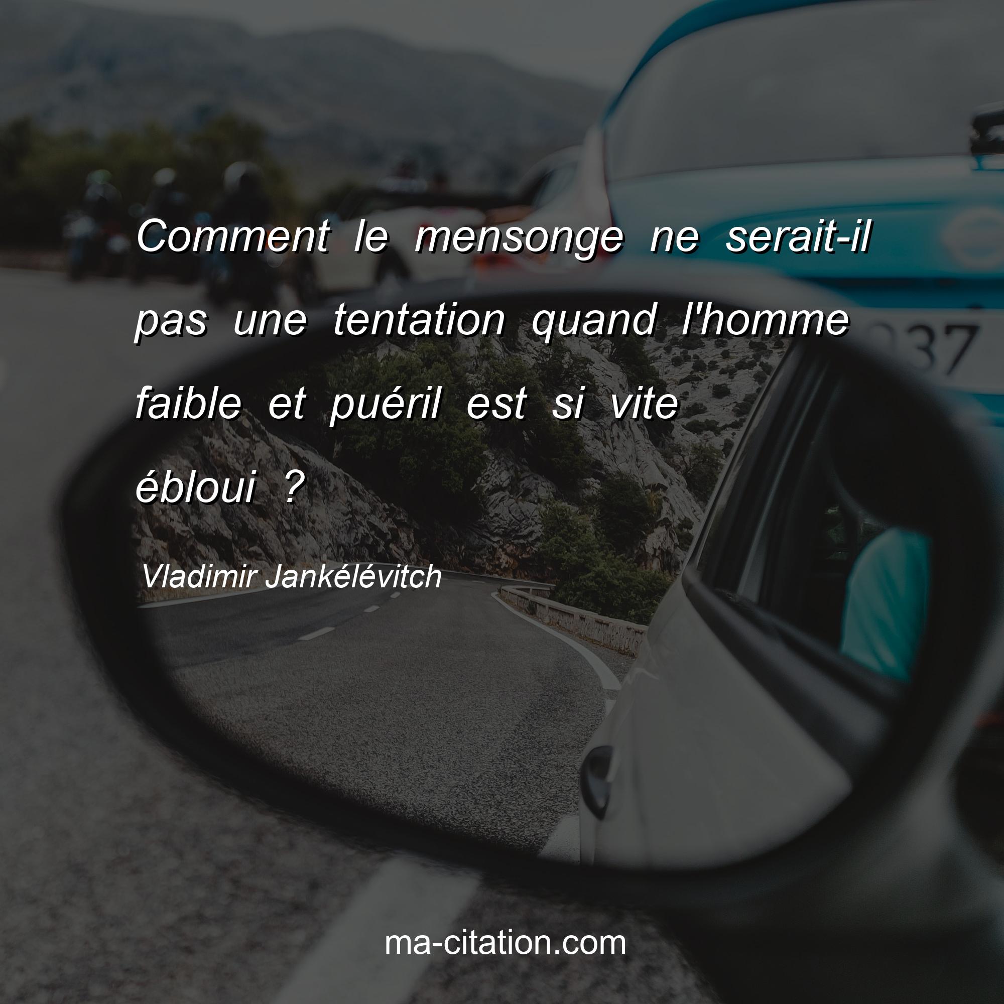 Citation sur la vie de Vladimir Jankélévitch :Comment le mensonge ne serait-il pas une tentation quand l'homme faible et puéril est si vite ébloui ?