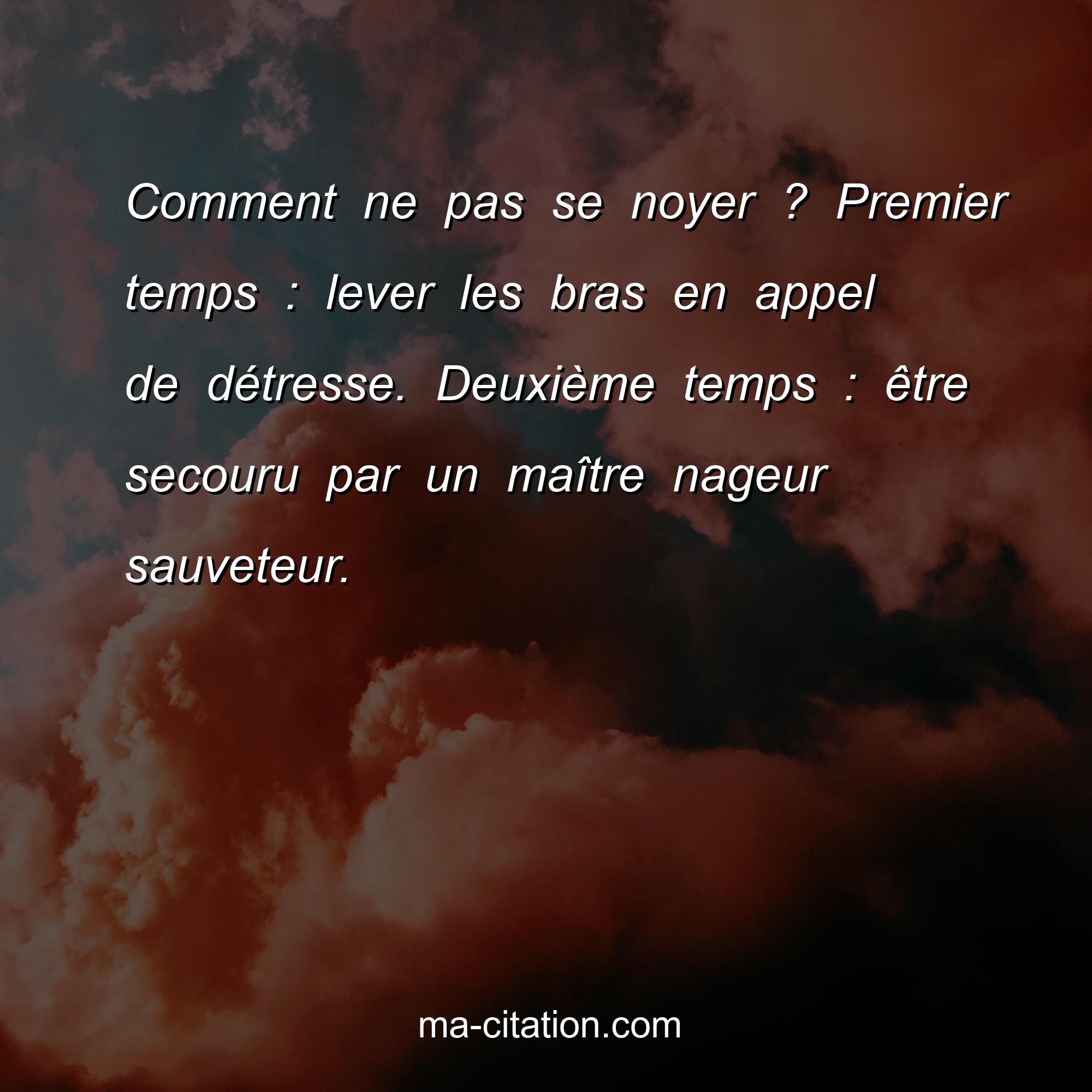 Citation sur la vie :Comment ne pas se noyer ? Premier temps : lever les bras en appel de détresse. Deuxième temps : être secouru par un maître nageur sauveteur.
