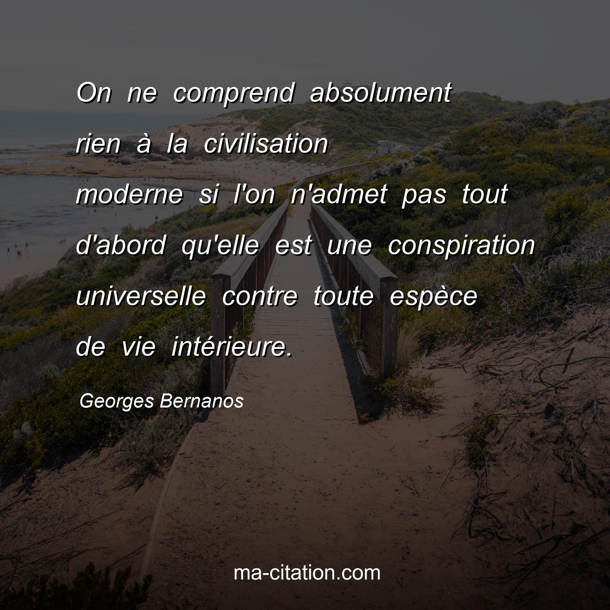 Citation sur la vie de Georges Bernanos :On ne comprend absolument rien à la civilisation moderne si l'on n'admet pas tout d'abord qu'elle est une conspiration universelle contre toute espèce de vie intérieure.