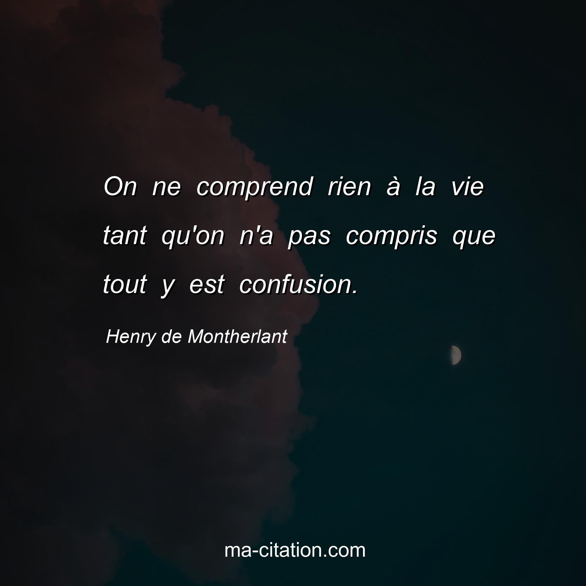 Citation sur la vie de Henry de Montherlant :On ne comprend rien à la vie tant qu'on n'a pas compris que tout y est confusion.
