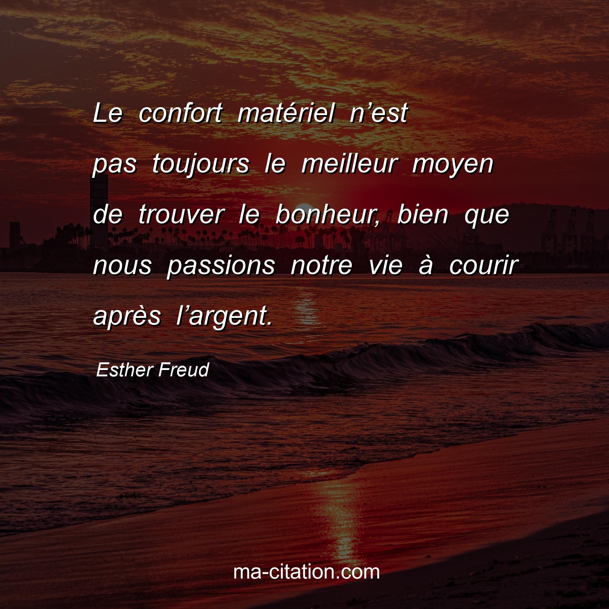 Citation sur la vie d'Esther Freud :Le confort matériel n’est pas toujours le meilleur moyen de trouver le bonheur, bien que nous passions notre vie à courir après l’argent.
