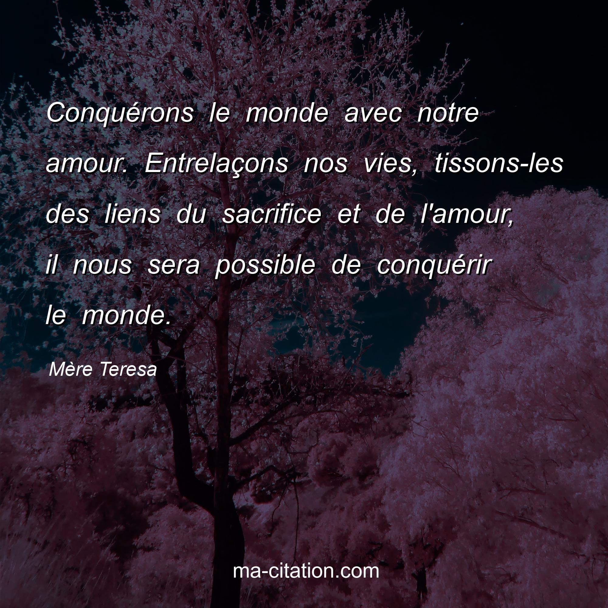 Citation sur la vie de Mère Teresa :Conquérons le monde avec notre amour. Entrelaçons nos vies, tissons-les des liens du sacrifice et de l'amour, il nous sera possible de conquérir le monde.