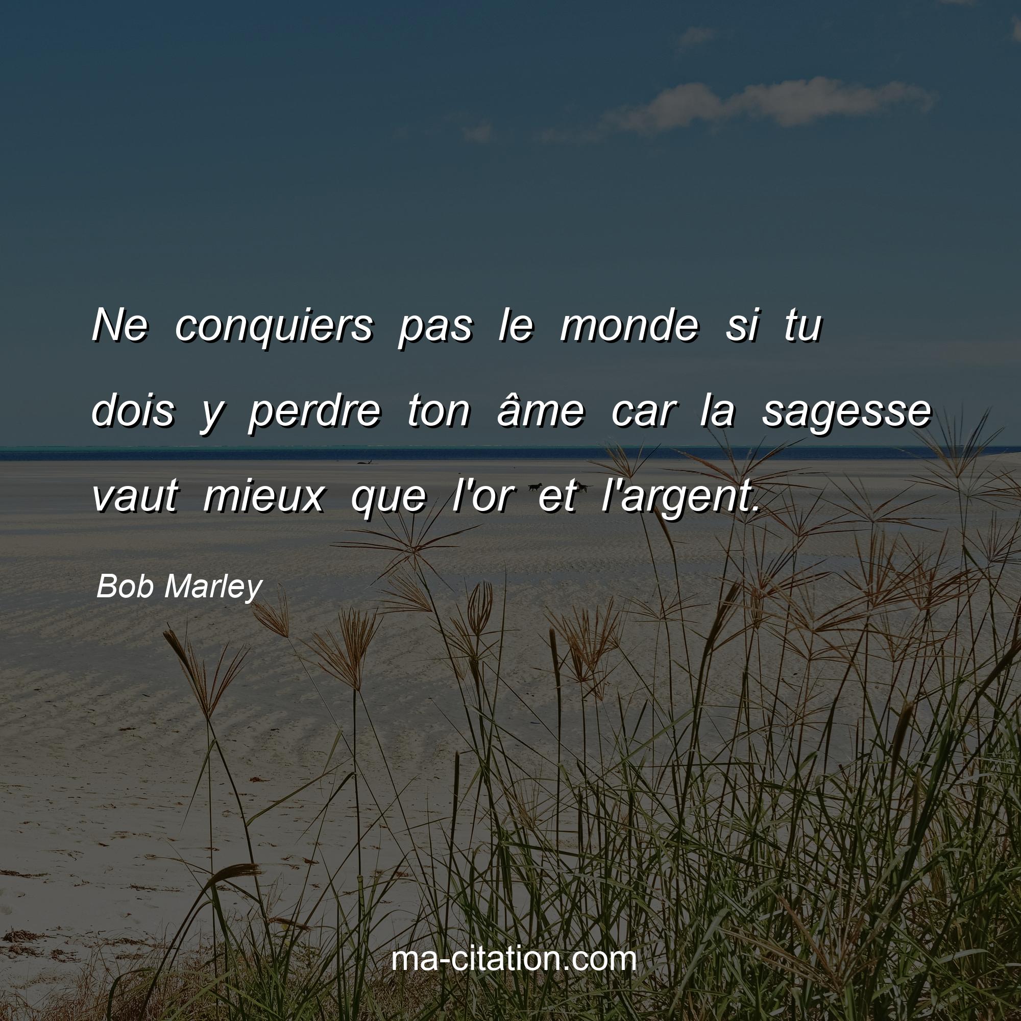 Bob Marley est l'auteur de la citation sur la vie "Ne conquiers pas le monde si tu dois y perdre ton âme car la sagesse vaut mieux que l'or et l'argent.".