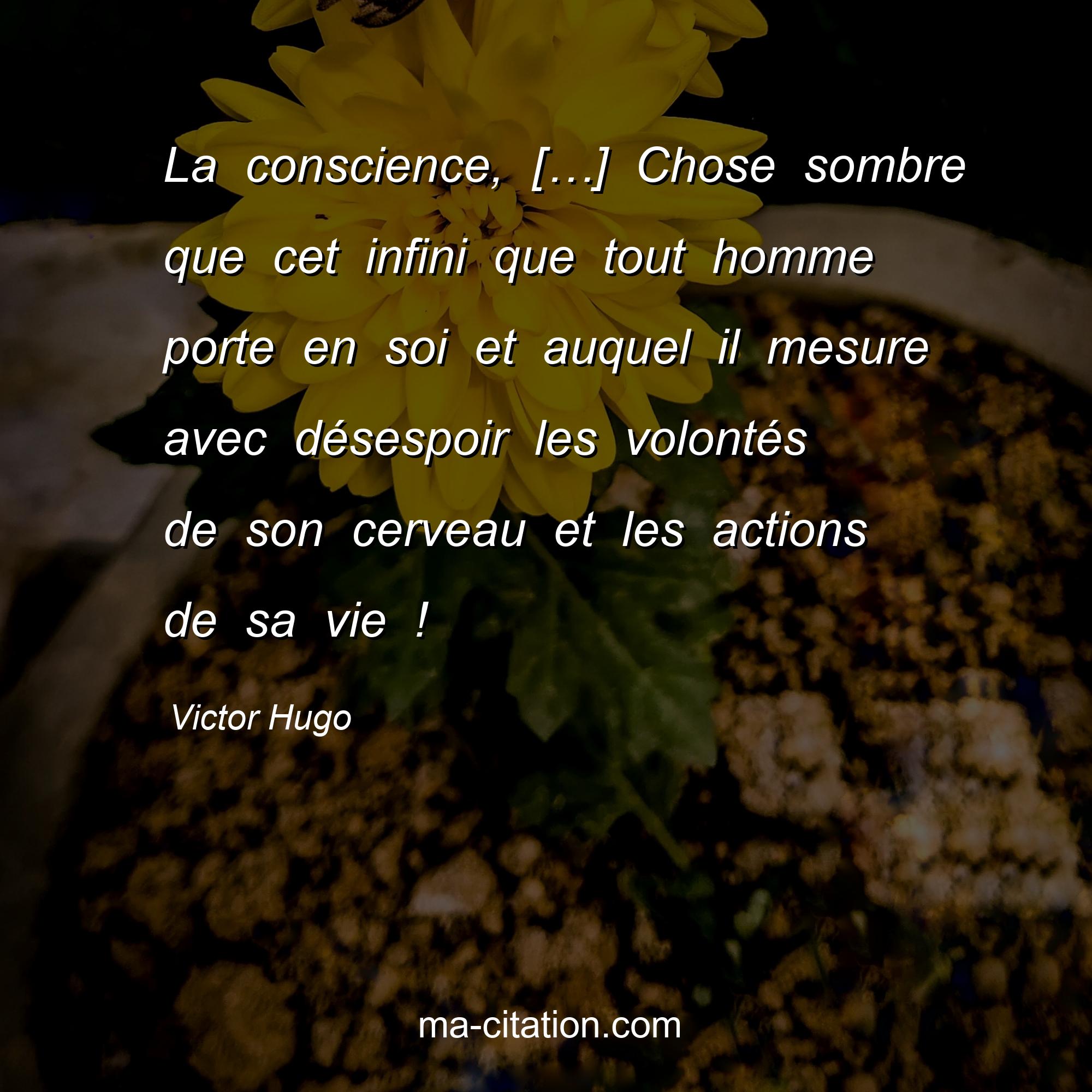 Citation sur la vie de Victor Hugo :La conscience, […] Chose sombre que cet infini que tout homme porte en soi et auquel il mesure avec désespoir les volontés de son cerveau et les actions de sa vie !
