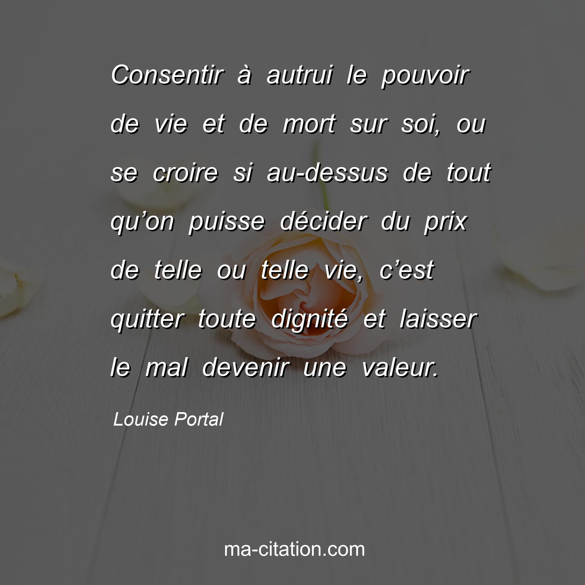 Louise Portal est l'auteur de la citation sur la vie "Consentir à autrui le pouvoir de vie et de mort sur soi, ou se croire si au-dessus de tout qu’on puisse décider du prix de telle ou telle vie, c’est quitter toute dignité et laisser le mal devenir une valeur.".