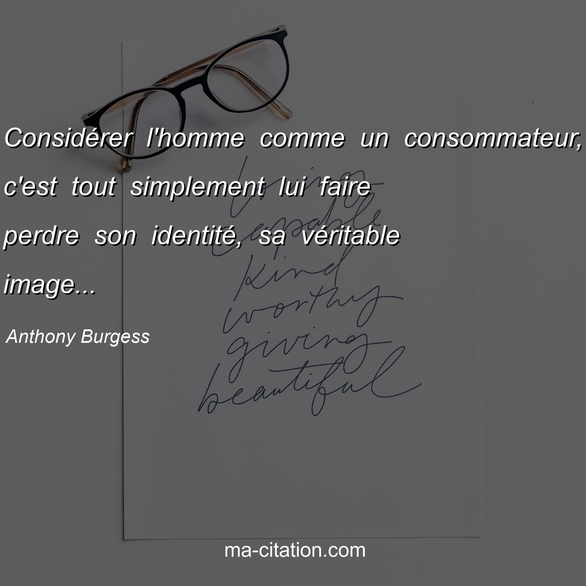 Citation sur la vie d'Anthony Burgess :Considérer l'homme comme un consommateur, c'est tout simplement lui faire perdre son identité, sa véritable image...