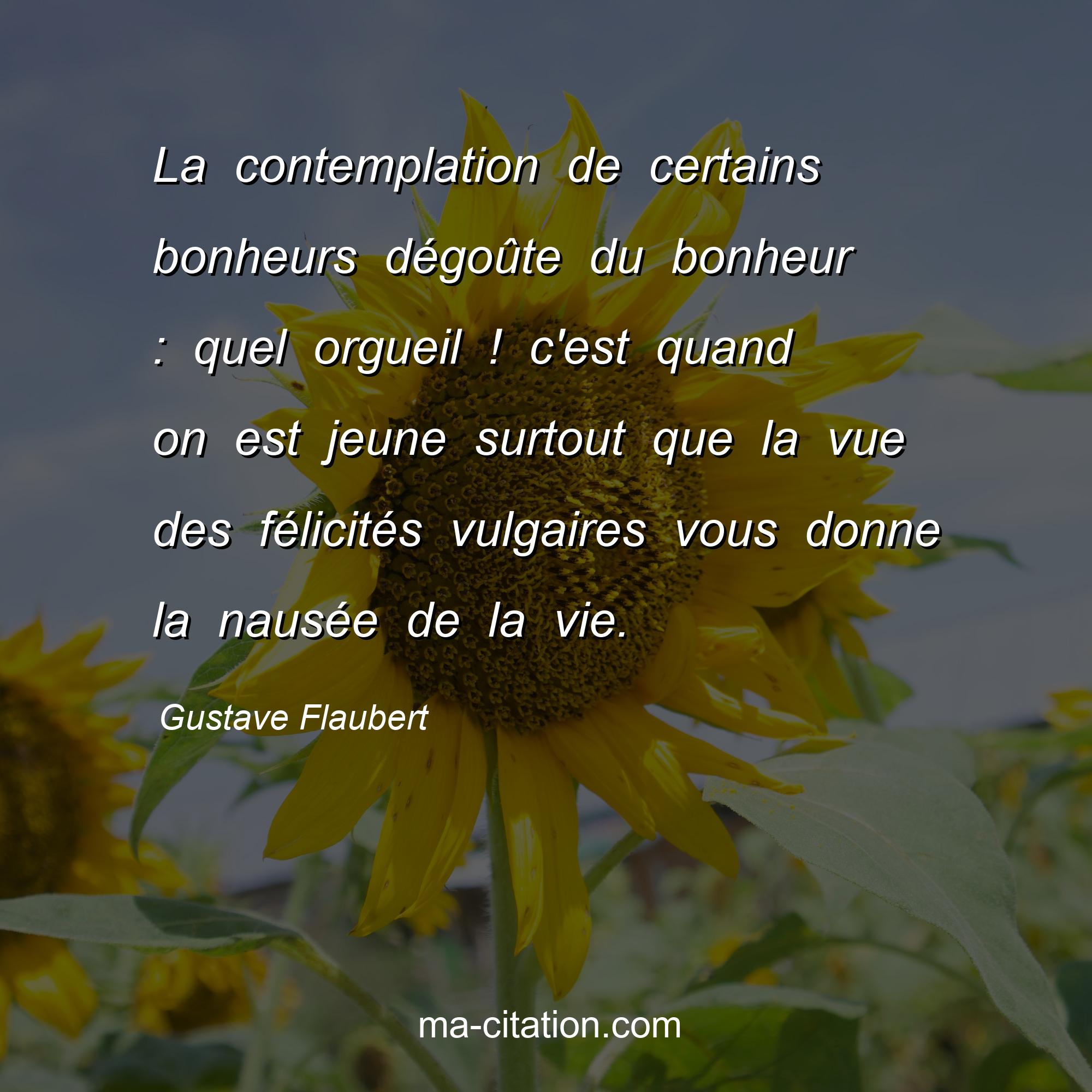 Citation sur la vie de Gustave Flaubert :La contemplation de certains bonheurs dégoûte du bonheur : quel orgueil ! c'est quand on est jeune surtout que la vue des félicités vulgaires vous donne la nausée de la vie.