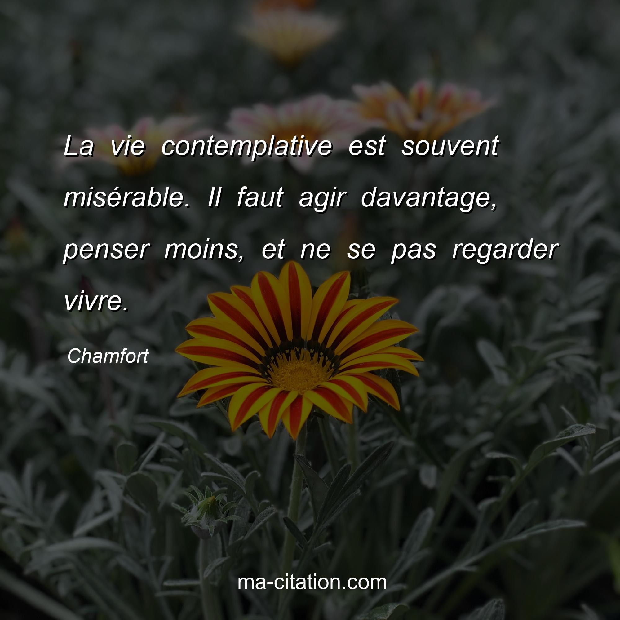 Citation sur la vie de Chamfort :La vie contemplative est souvent misérable. Il faut agir davantage, penser moins, et ne se pas regarder vivre.
